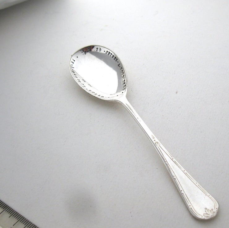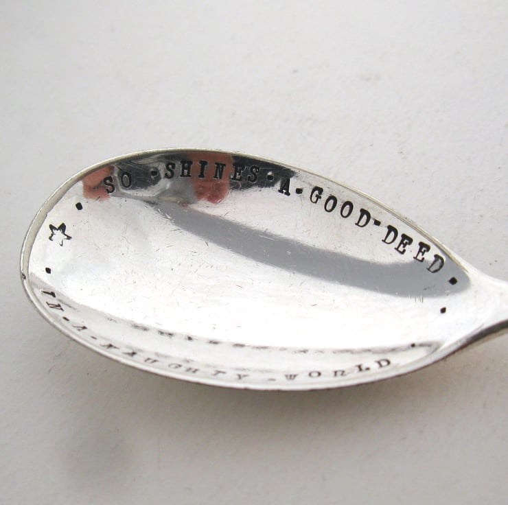 'So shines a good deed in a naughty world' - the perfect Shakespeare quote to put on a shiny thing. I've hand stamped the words in tiny capital letters around the edge of a vintage silverplated sauce spoon, and added a little star.