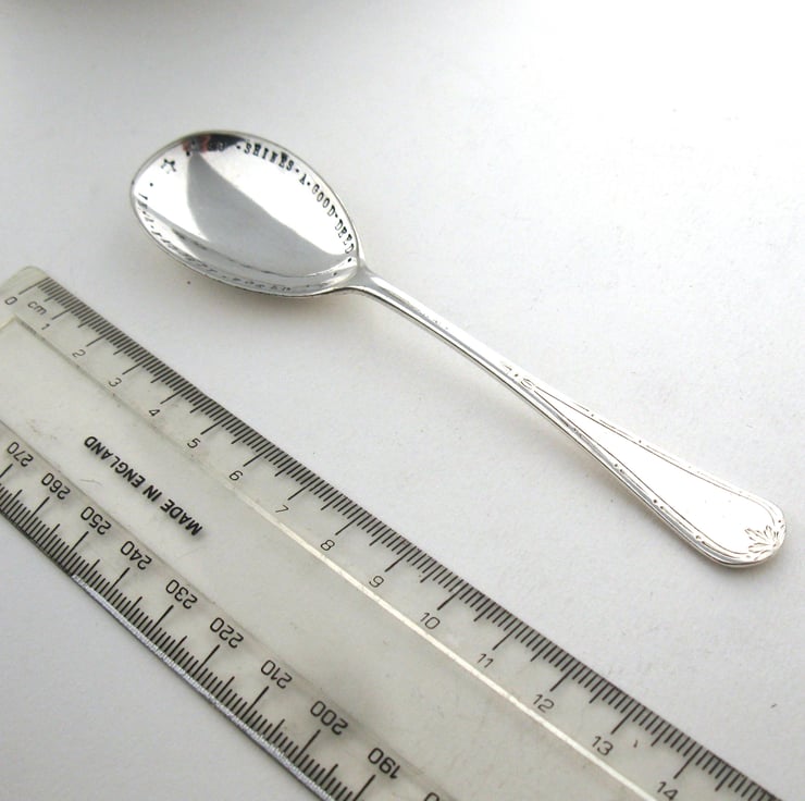 The spoon has a shallow oval bowl and an elegantly flared handle with a little bit of neoclassical engraved detailing. It measures 5 1/2" (14cm) long. It is still quite shiny for its age (from the style I'd guess it dates from the 1910s to 1920s) but it is a used vintage item so it does show signs of surface wear, as you can see in the pictures.