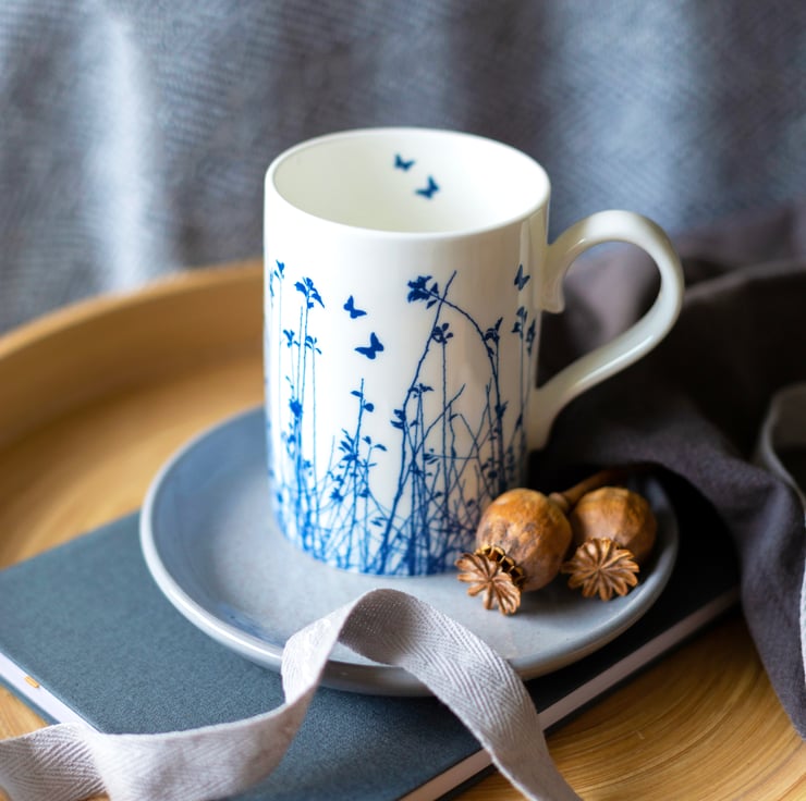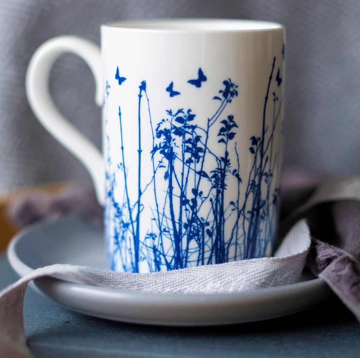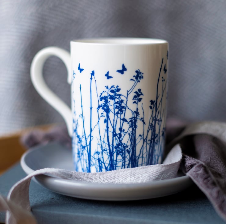The original designs for these fine bone china mugs were created using the old photographic process of Cyanotype in which the solution used reacts with sunlight to produces distinctive blue tones.