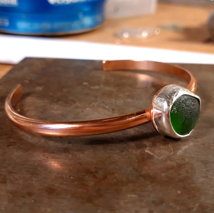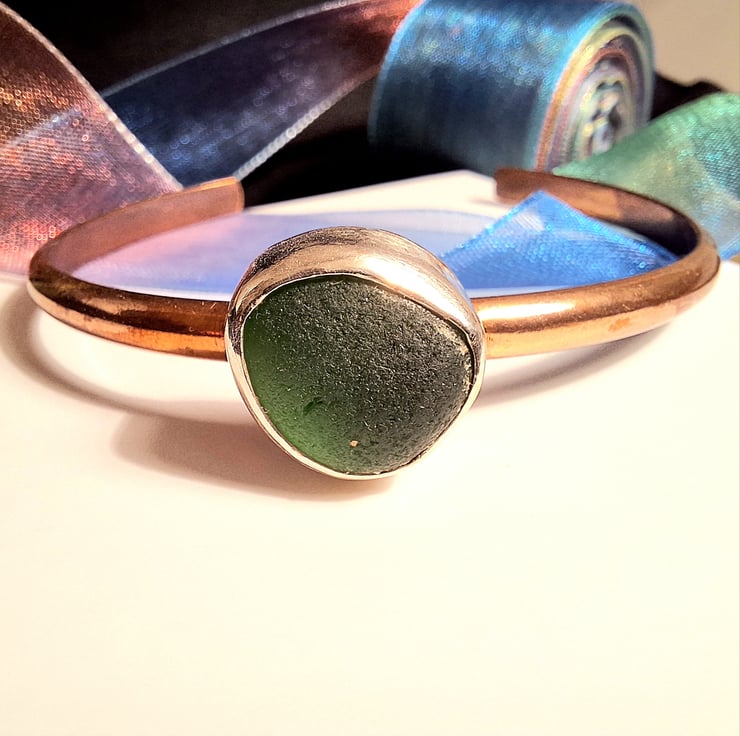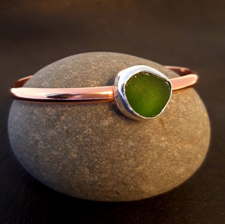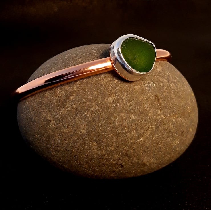 This one off bangle features a lovely mid green piece of seaglass from Clevedon, Somerset. It has been set in silver and mounted on a lovely dark copper bangle. The seaglass is approx 1.2cm across and the bangle is size medium.