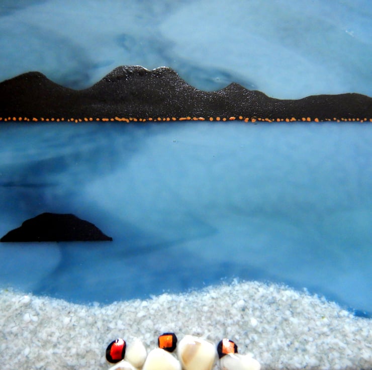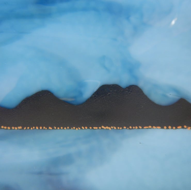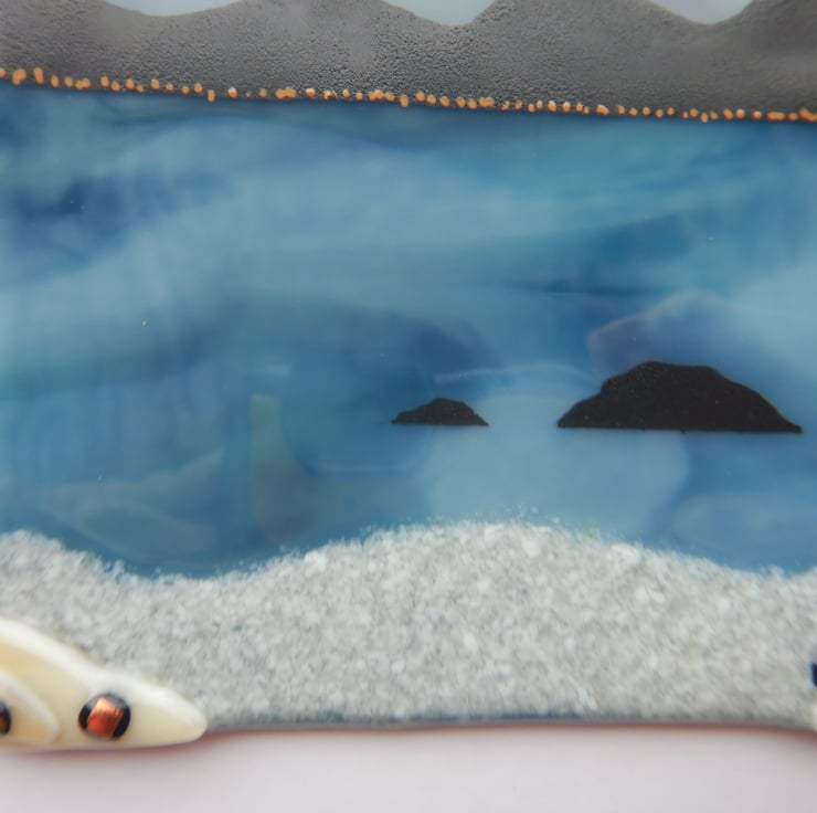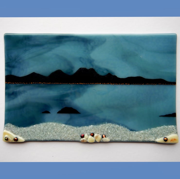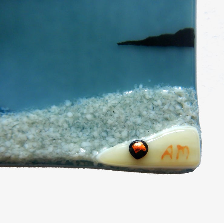 'ISLE OF JURA' is a subtle mix of Scottish colours. The actual isle has been very carefully painted using finely ground powdered glass. The foreground is cut shapes of streaky brown and caramel sheet glass. A tiny bit of bling has been added by scattering little sections of dichroic glass. Once the picture was completed it was then fused in my kiln at 1400 where all sections became one!