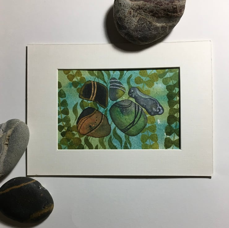 This original painting is on hand made Khadi watercolour paper and uses artist quality materials. Some of the pebbles have a subtle metallic shimmer.It measures approx 15cm x 10cm and will be sent with a mount in a cello bag within a sturdy envelope. Postage is free to UK destinations.