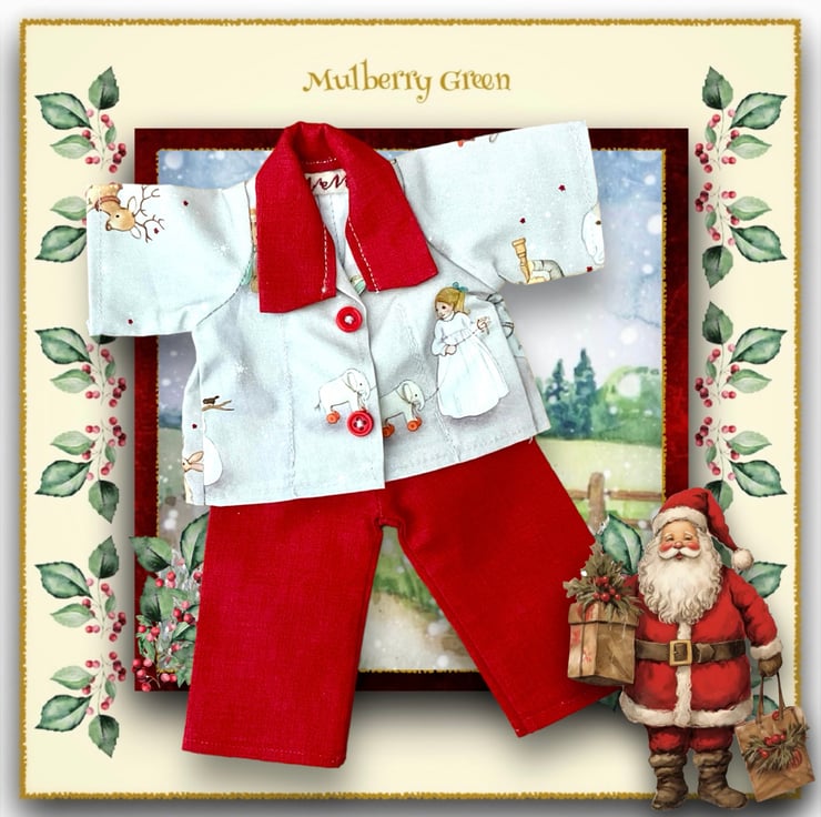 Cute little pyjamas in a Belle and Boo designer print, to fit the Mulberry Green characters. The pyjamas are made from best quality cotton and fasten at the front with two little poppers underneath the buttons.