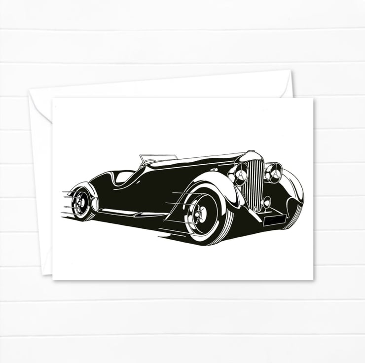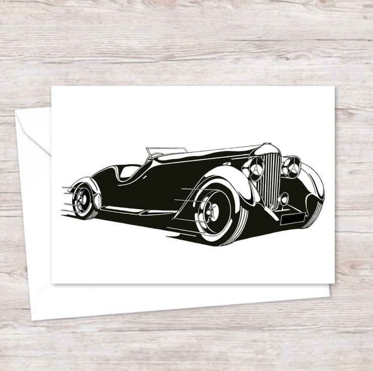 An original art greetings card featuring a hand-drawn pencil illustration of a classic thirties sports car. The detailed artwork captures the essence of this timeless beauty, with it's sleek art deco design.