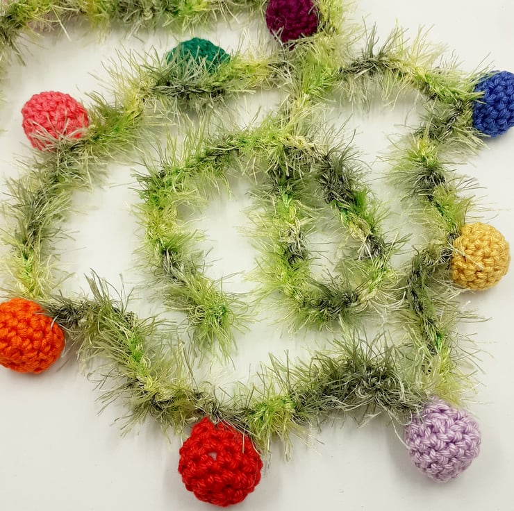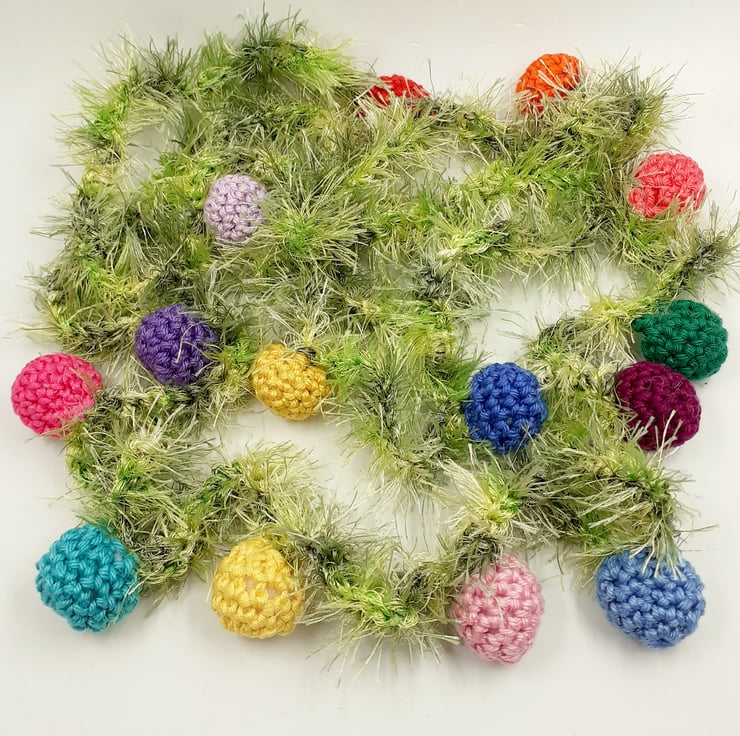 This festive garland is designed to make your Christmas merry and bright! The greenery is crocheted in soft eyelash yarn and is decorated with balls in 12 cheerful colours. The balls are crocheted in cotton and filled with polyester stuffing. The whole garland measures approximately 2m long and comes wrapped in tissue in a labelled PIP (Postage in Proportion) box all ready to be given or posted on as a gift if required.