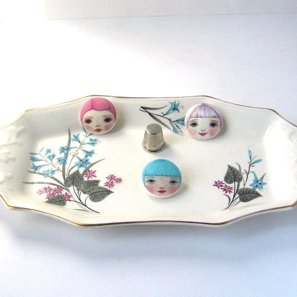 The delicate doll face images on these unique fabric covered sewing buttons are hand drawn then digitally printed on to 100% cotton. I hand sew the cloth on to button blanks to ensure correct placement of the doll face and a nice neat secure finish.