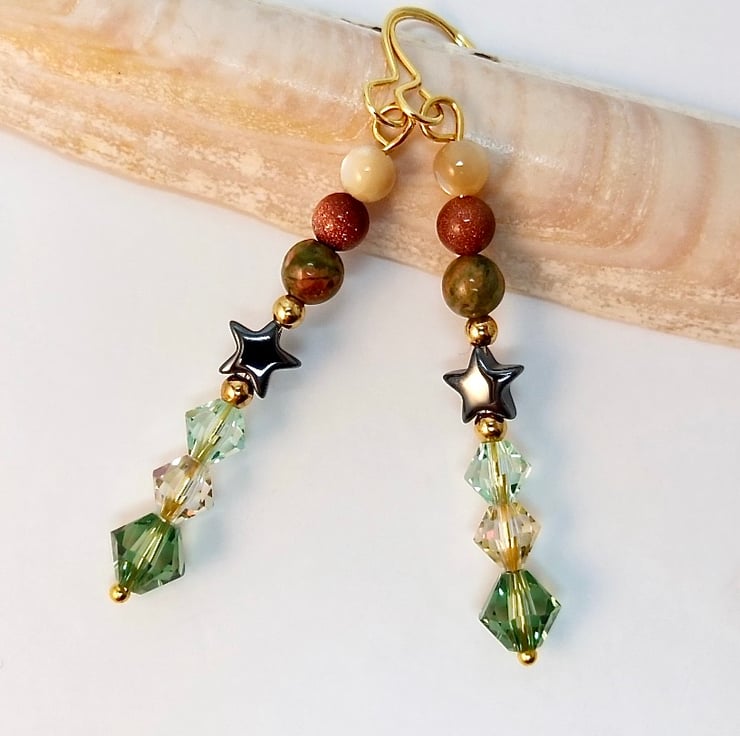 Above the star are 4mm beads of Unakite, Goldstone and Mother-of-Pearl.
