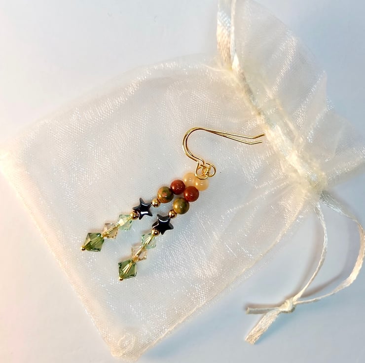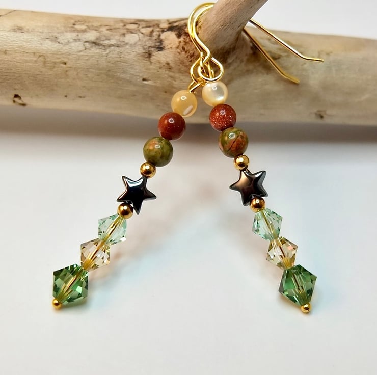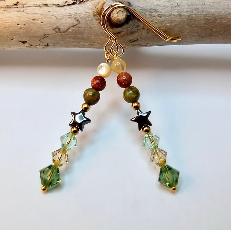 Starting from the bottom of each earring and working up, I have used Swarovski 6mm and 5mm crystals in the colours 'erinite', 'luminous green' and 'chrysolite' topped with a 6mm Hematite puffed star highlighted with 2.5mm gold vermeil rounds.