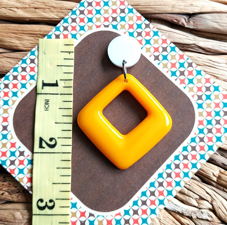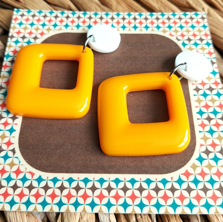 These 1960's inspired earrings have been made from resin, the diamond shaped drop is finished in a gorgeous sunny yellow. The 15mm flat top is made in white resin.