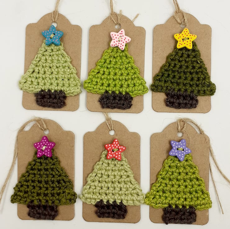 A set of six pretty yet sturdy gift tags each featuring a Christmas tree crocheted in 100% cotton and topped with a painted wooden star button. The back of each tag is blank for your own message. The tags measure approximately 7 cm x 4 cm and are completed with a length of fine jute.