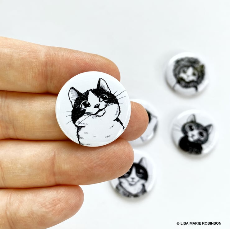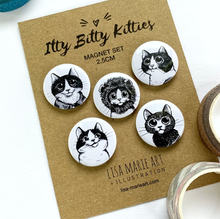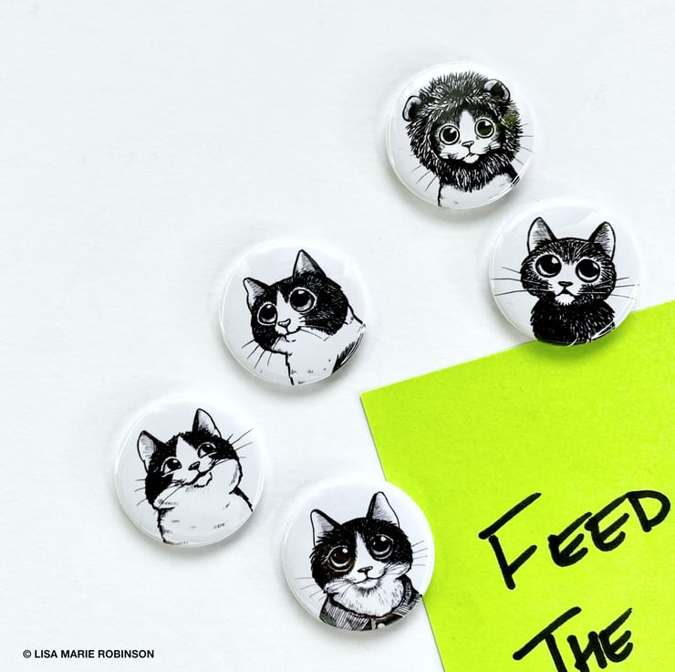 5 mini fridge magnets featuring cat illustrations by UK artist Lisa Marie Robinson.