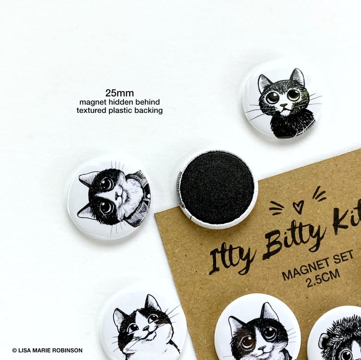 Every magnet in this set features a different black & white pen and ink style drawing of cat, each one with their own purr-sonality. The images are mini prints of my artwork that has been adapted to fit the magnets.