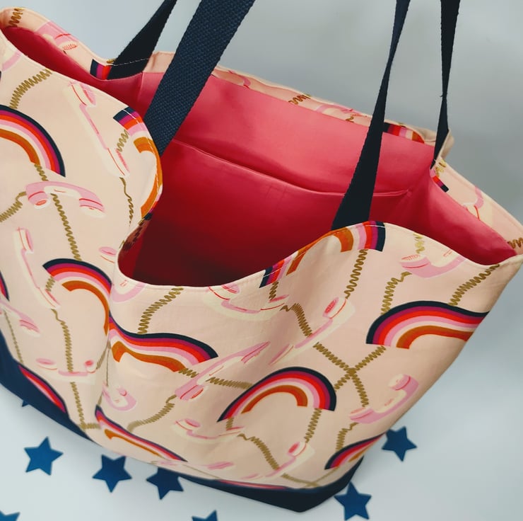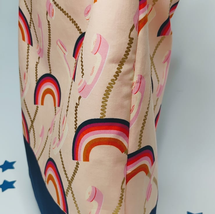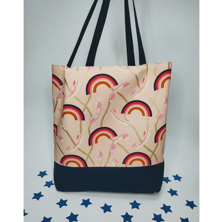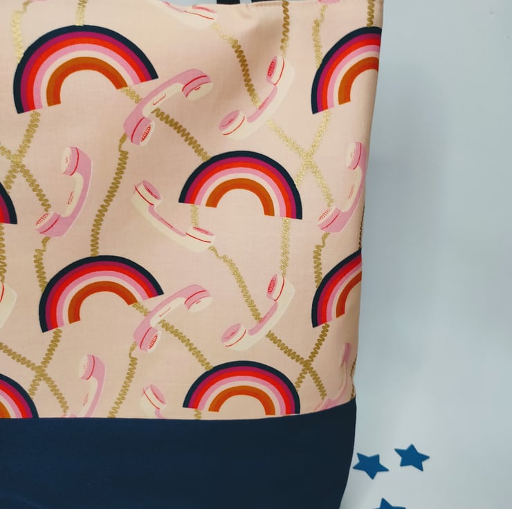 Rainbows and telephones are a match made in heaven on this contemporary large tote bag. A gentle pink for the background with rainbows and phones and gold shimmering phone cords to add to the fun.