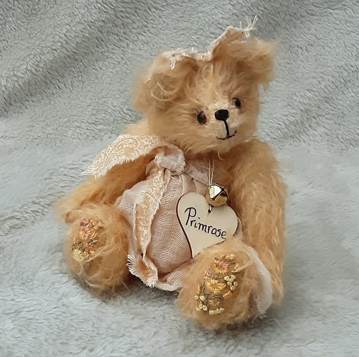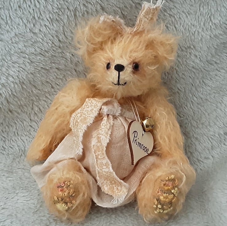 Meet Primrose, a teeny bear standing at only 6" tall and hand sewn from a lovely ratinee mohair in sunshine yellow.