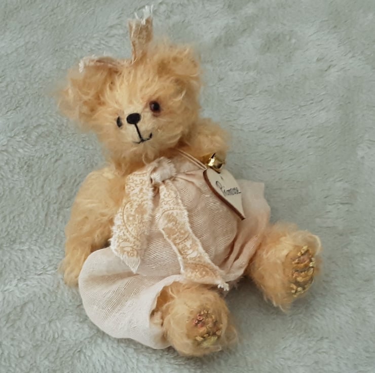 A one-off unique little bear she would be happy in any surroundings. She wears her name on a wooden tag and Bearlescent is to the back of one ear on a polymer clay button.