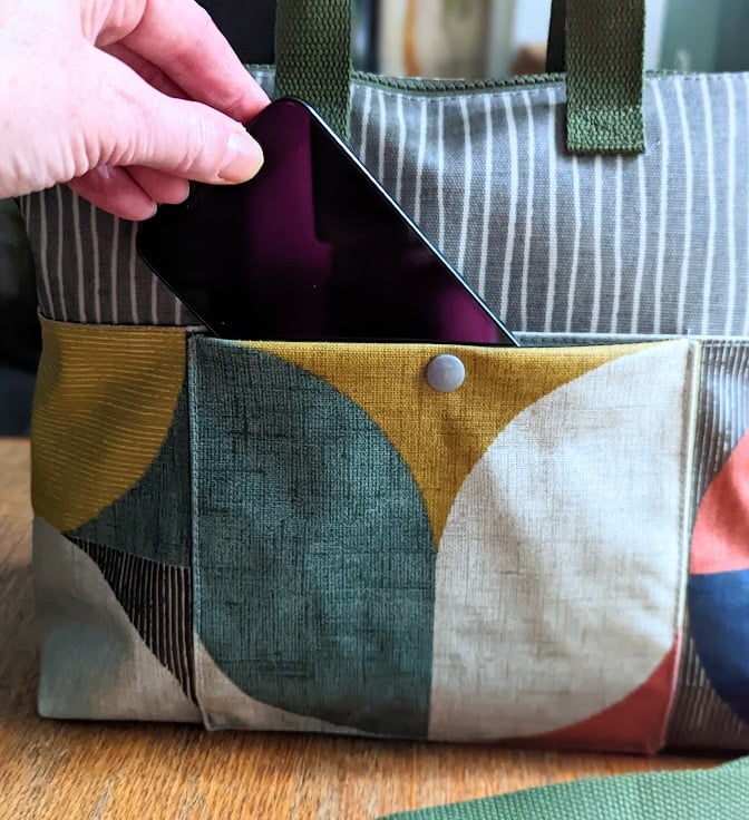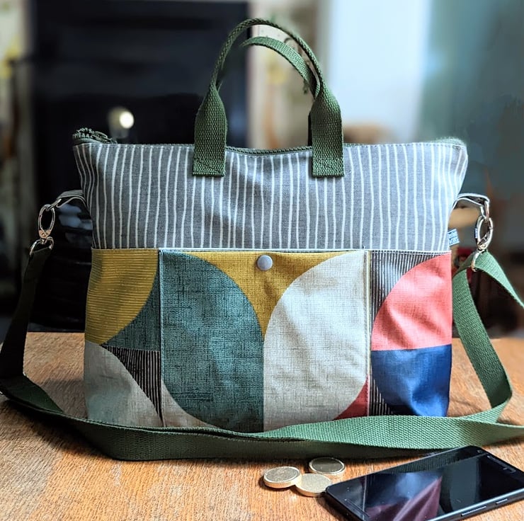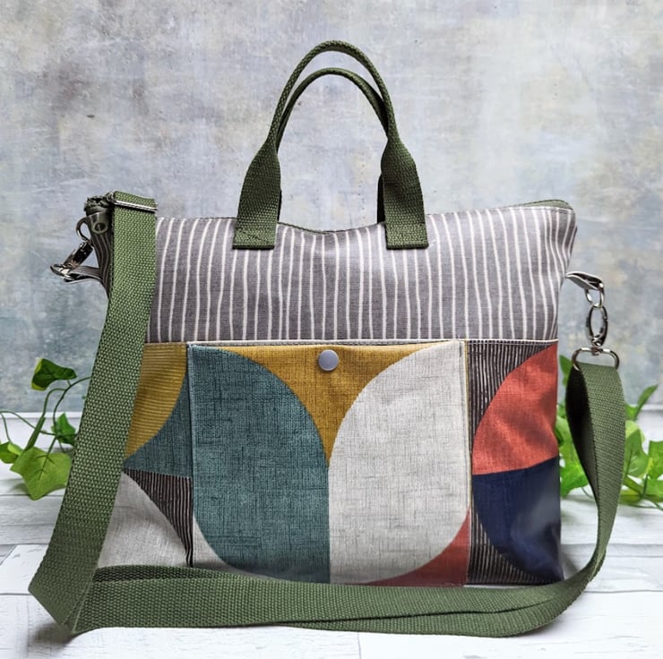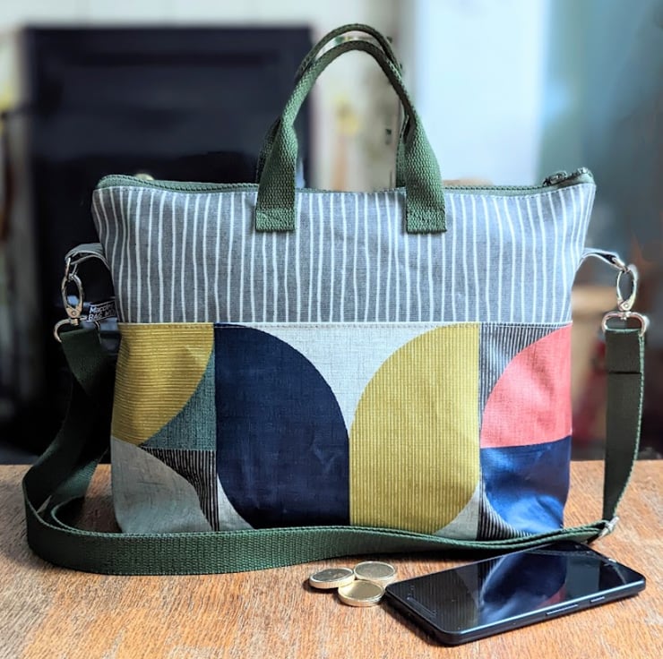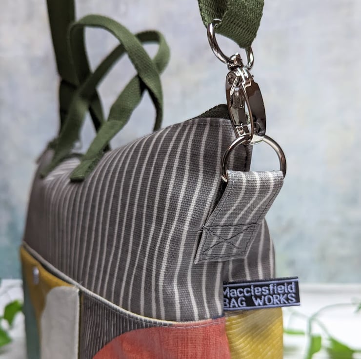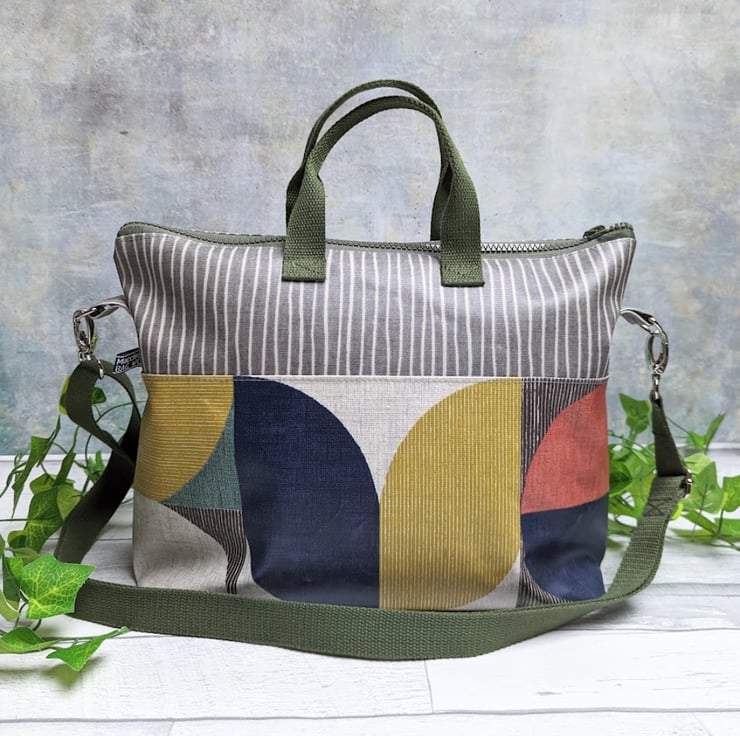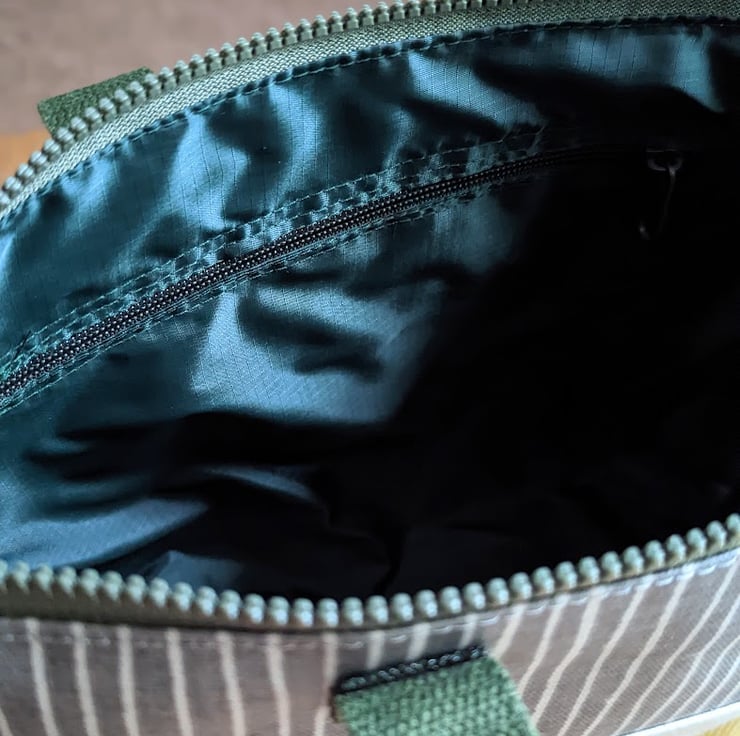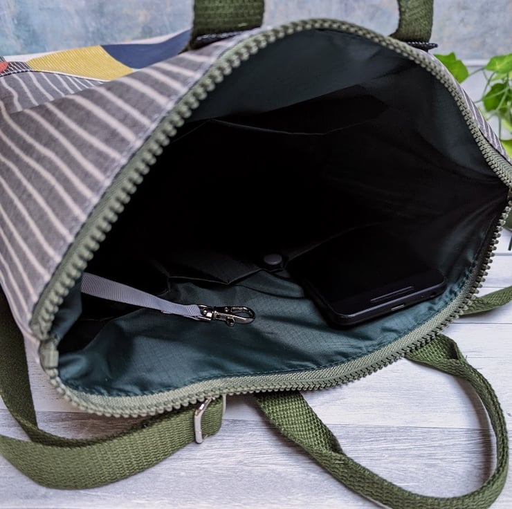 It has a geometric print teamed with a striped matt PVC coated cotton (oilcloth), a zipped top and is lined with a dark green rip-stop nylon lining.