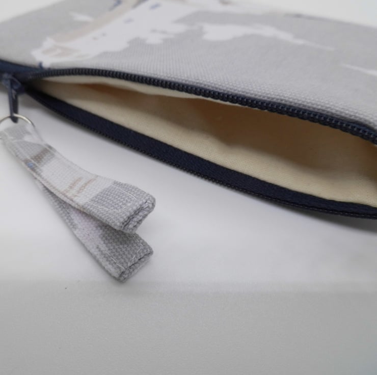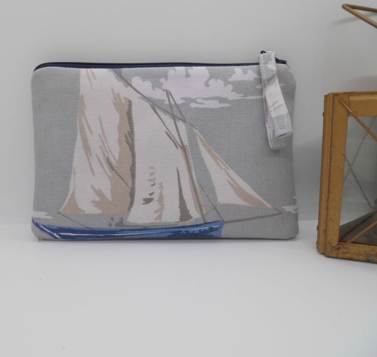 This make up purse is made using a furnishing weight fabric which has a light grey background and nautical themed print. There's a sailing boat on one side and a lighthouse on the other.