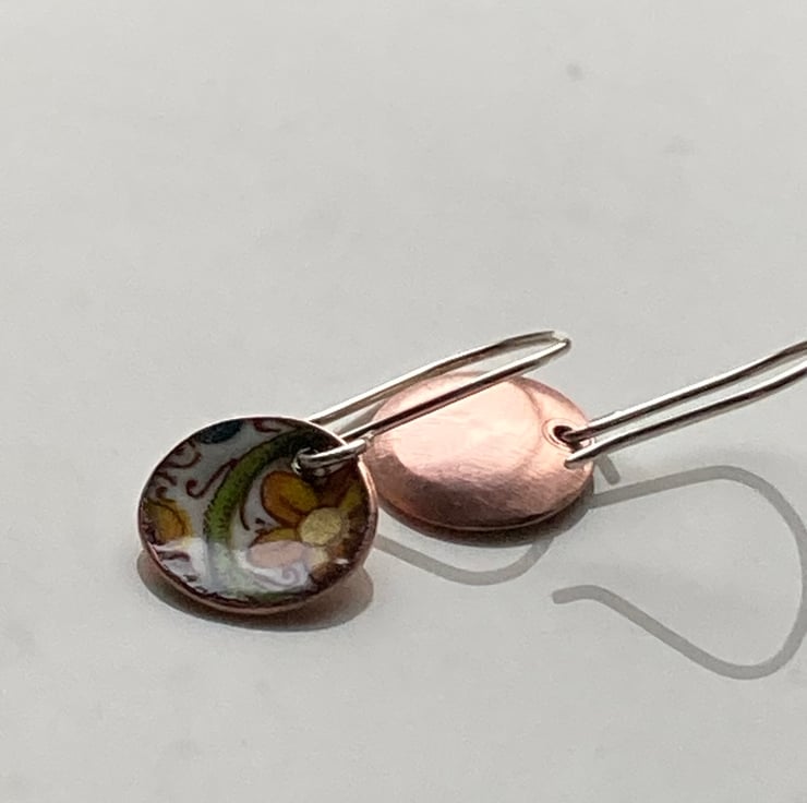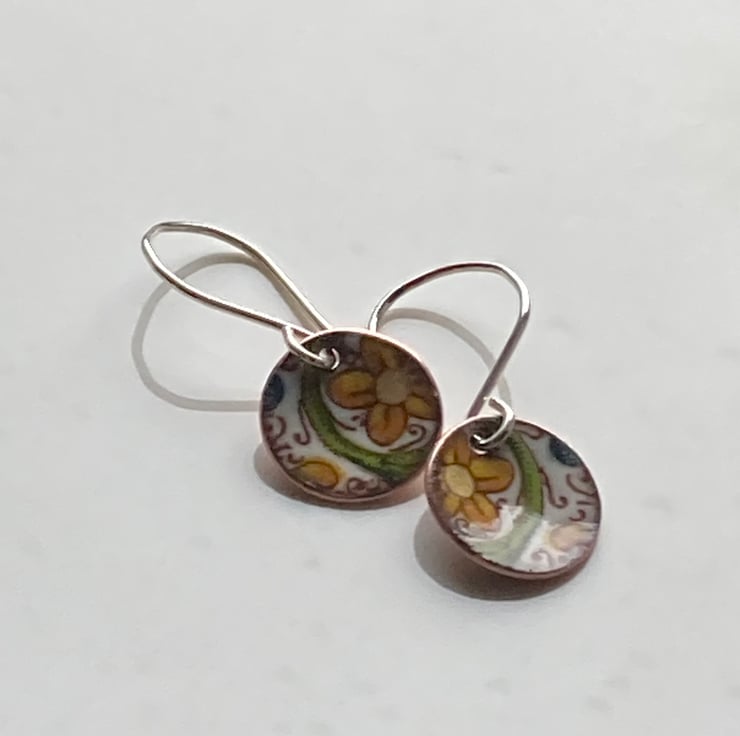 Enamelled copper disk earrings, decorated with an elaborate pattern featuring yellow flowers and a vine. Each disk is slightly concave, measures 13mm in diameter and has a natural copper finish on the back. The earring wires are handmade from sterling silver