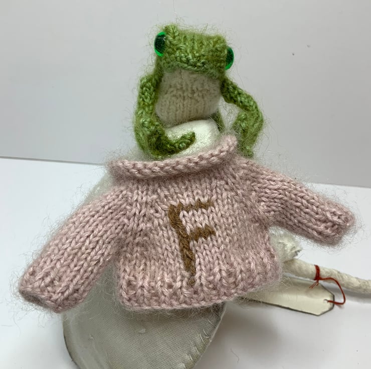 I thought some soft gentle feminine colours would suit this little frog - they are one of my favourite colour combinations and I feel she looks very happy with her little jumper.