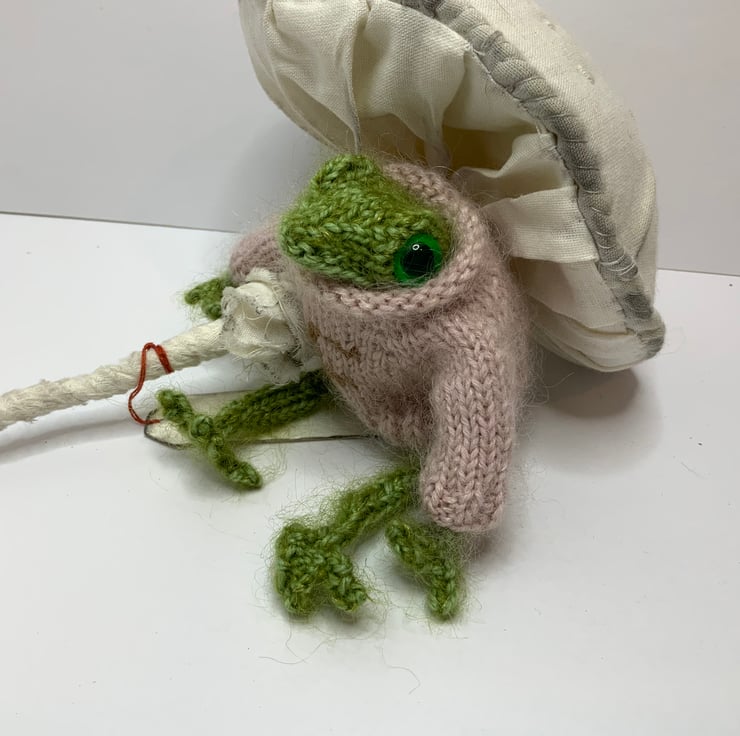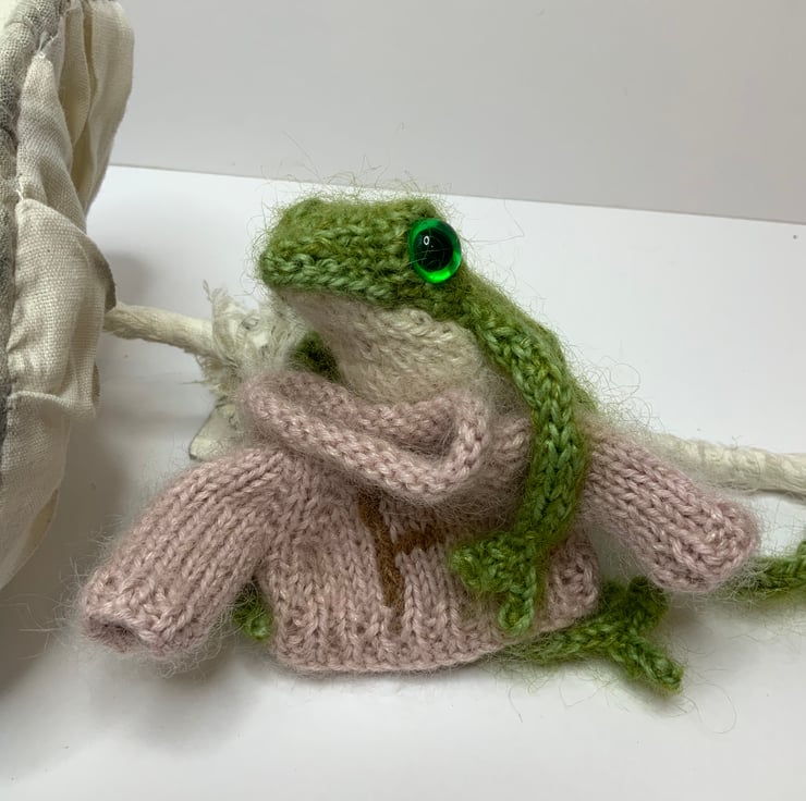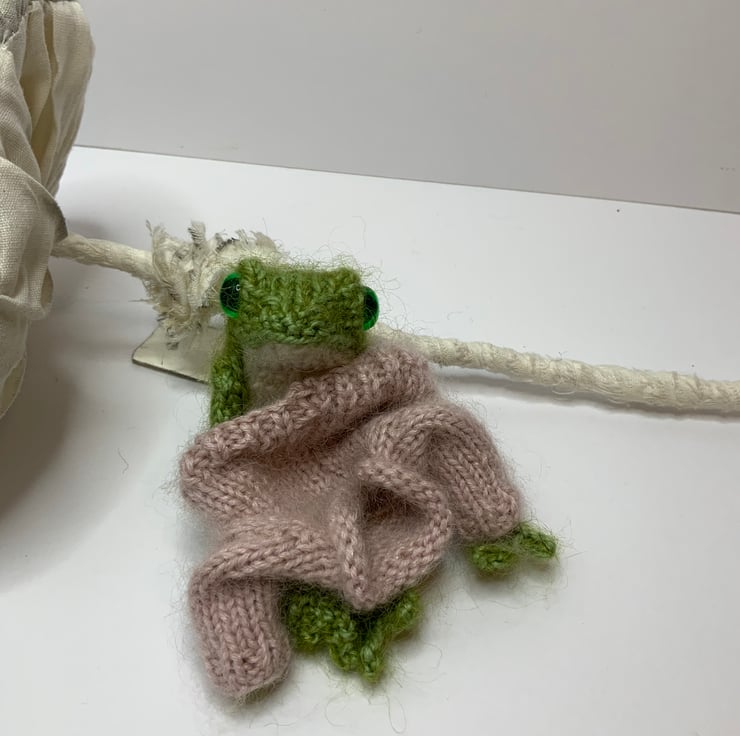 Hand knitted by me from a dot pebbles pattern, this little frog is knitted using a mix of Alpaca, kid silk and mohair yarns and is filled with 100% sheep wool.