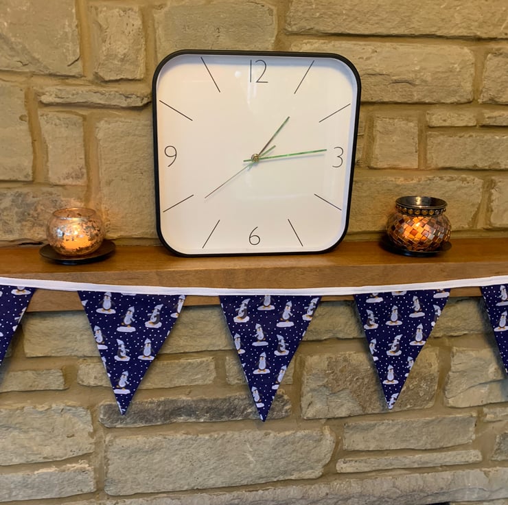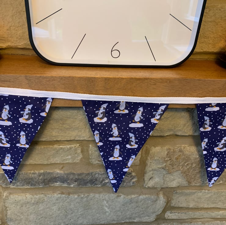 Featuring cute penguins dancing in the snow this string helps to set a festive scene. A whopping 3m with 15 large pennants all double sided with an inverse pattern on the reverse. Plus 30cm ties either end.