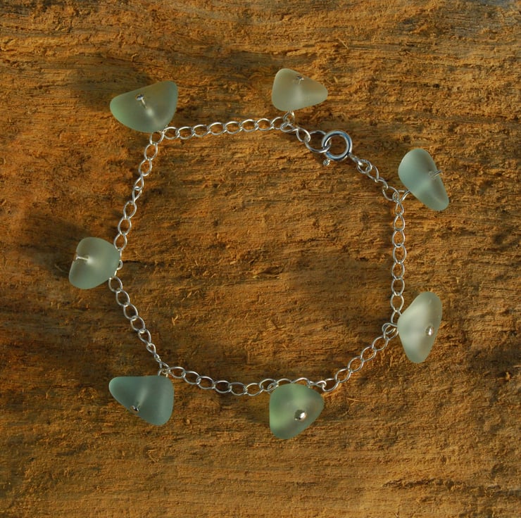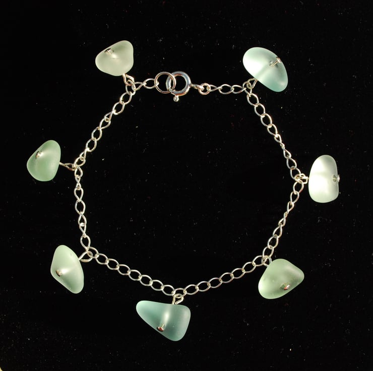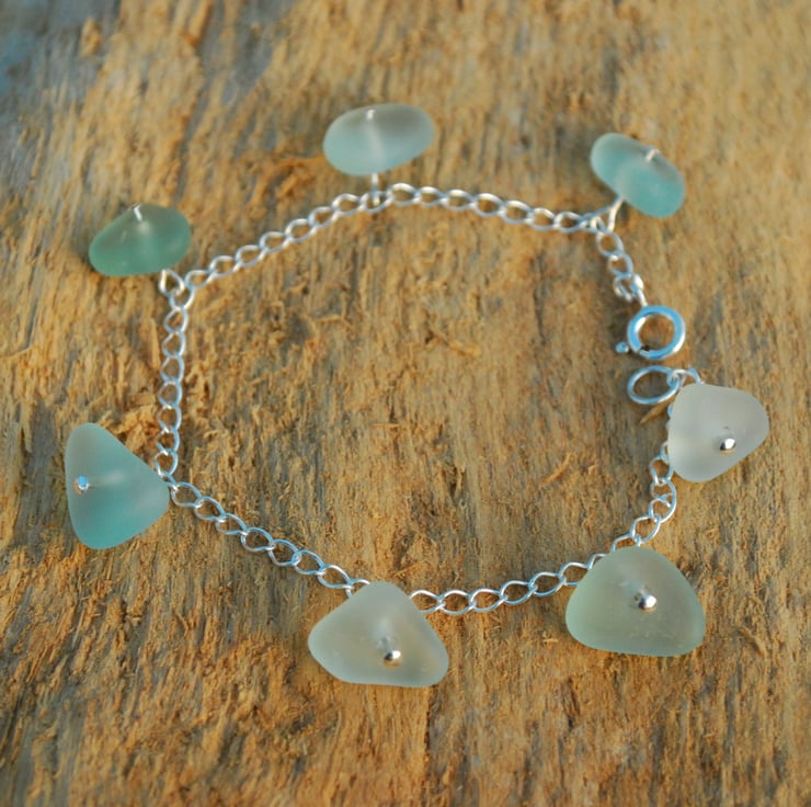 We've used thick pieces of tumbled beach glass to make this pretty bracelet. The glass has come from old bottles and is various shades of aquamarine. The pieces have been chosen to go together beautifully in shape and size. All the metal in this bracelet is sterling silver.