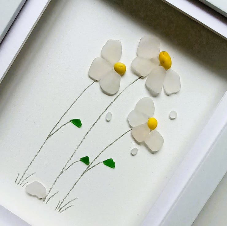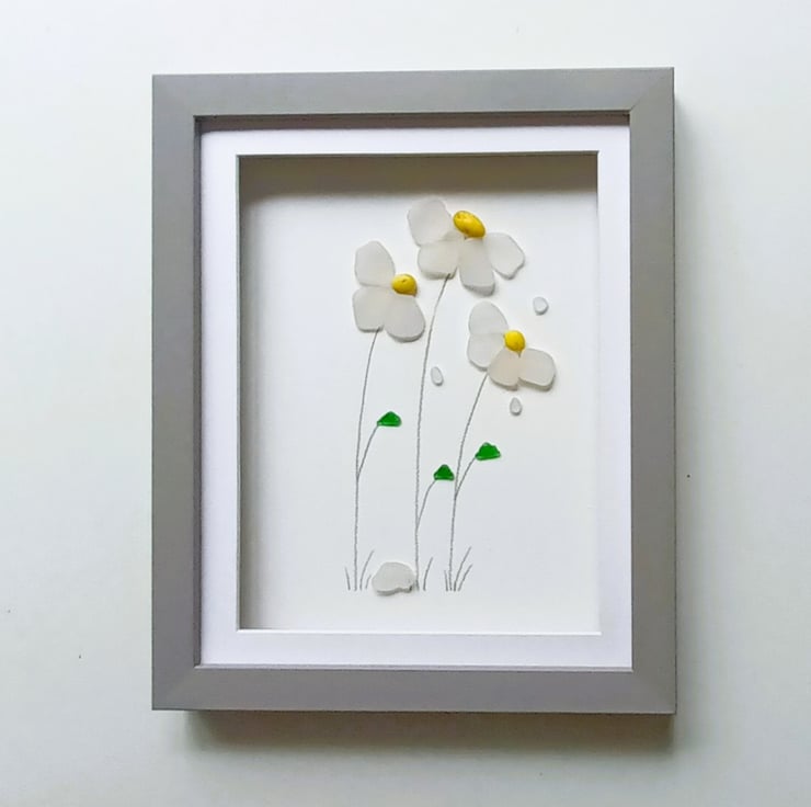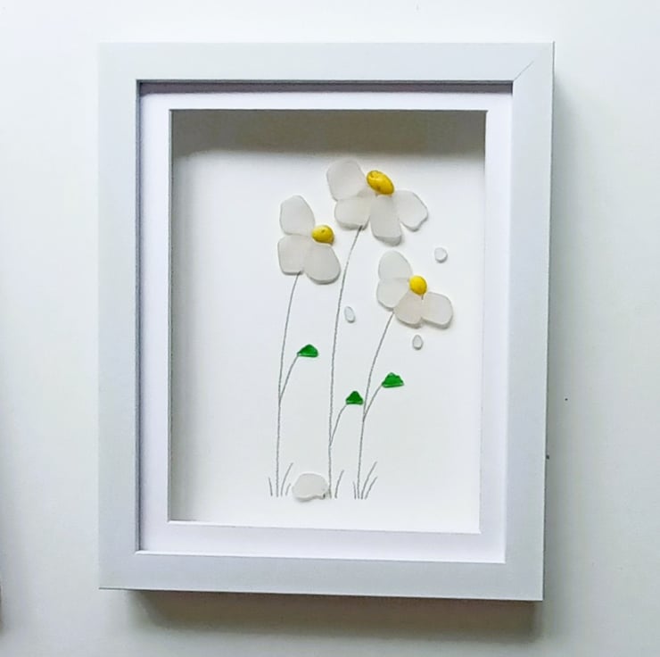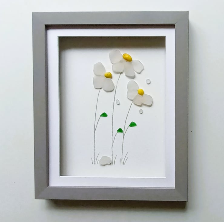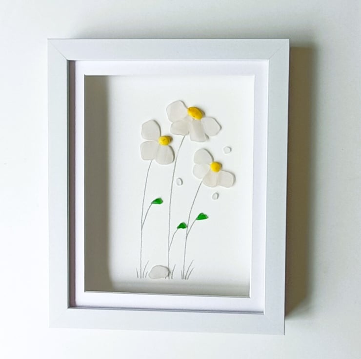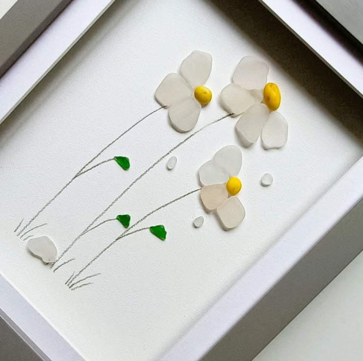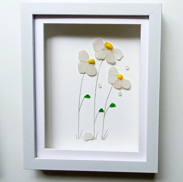 Windblown daisies made from nuggets of beautifully ocean shaped and smoothed Cornish sea glass set inside a 28cm x 24cm glass fronted box frame.
