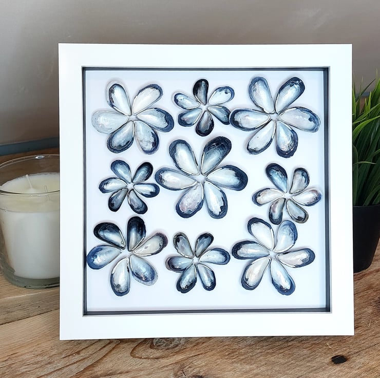 This 9x9in white frame, with black insert. Holds 9 mussel shell flowers. They are all of different sizes. Each shell is slightly different in colour.
