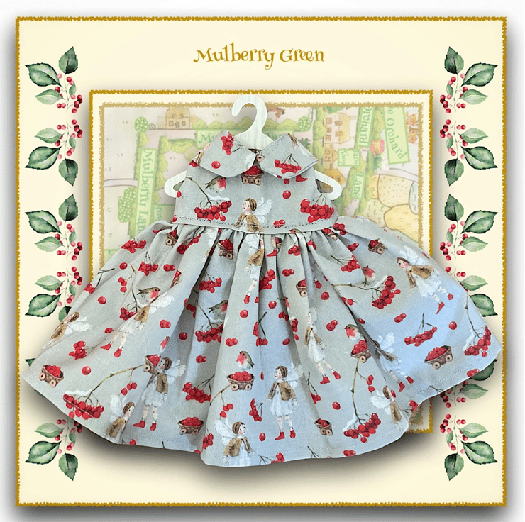 A beautiful Daniela Drescher Elves and Berries print dress. The dress is handmade from designer cotton, has a lined bodice and fastens at the back with a little popper. A gorgeous gift for a little one at Christmas - or indeed for anyone who loves dolls.