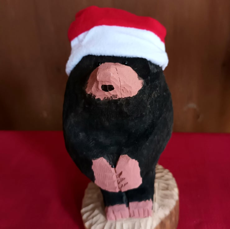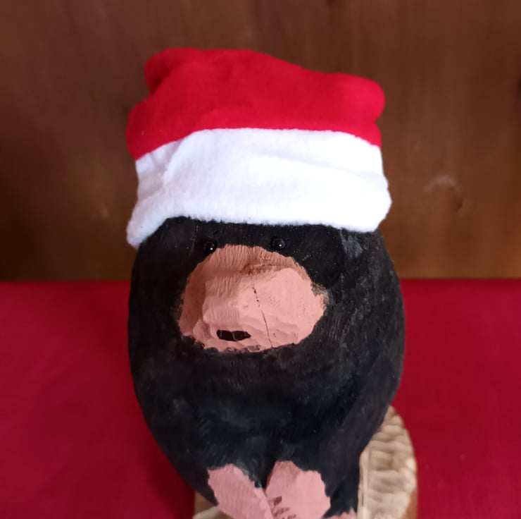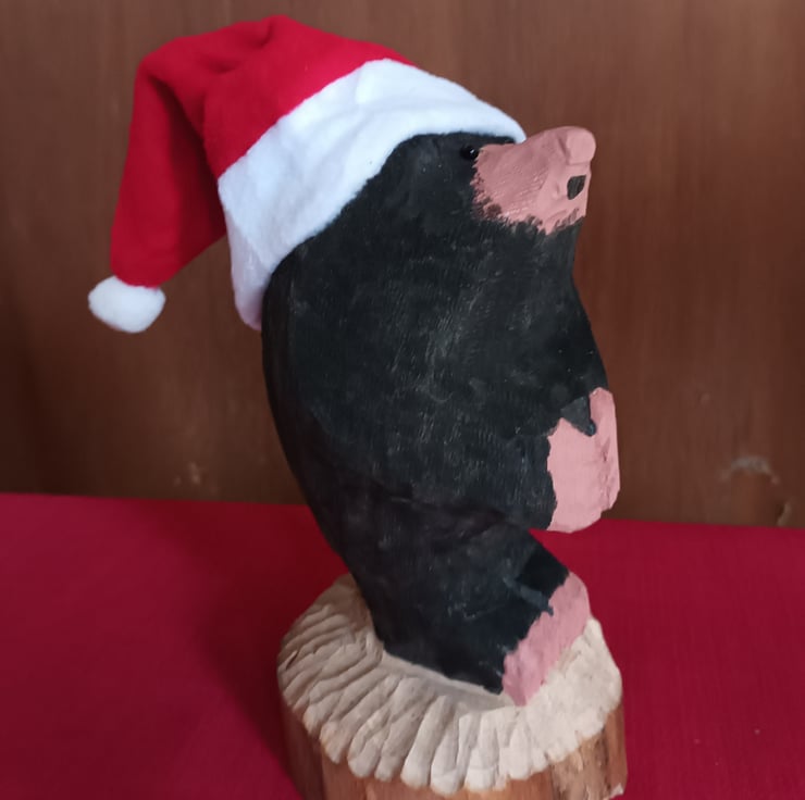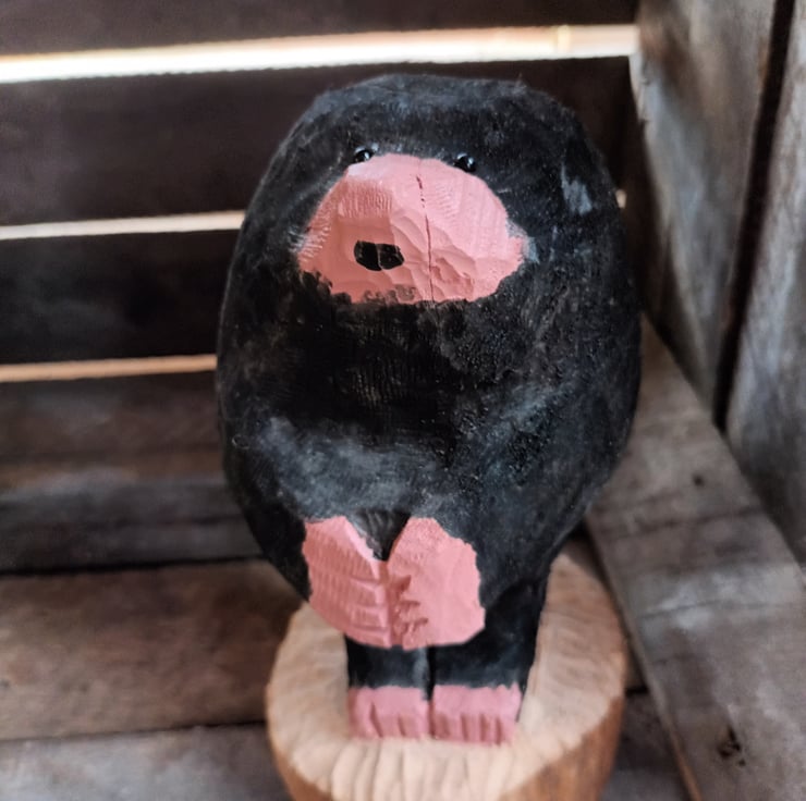 This endearing little mole is carved from a piece of beech. It has been chainsaw carved then finished with sanding and chisel work.