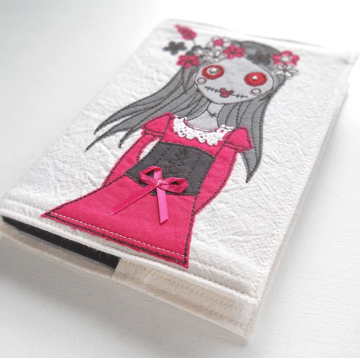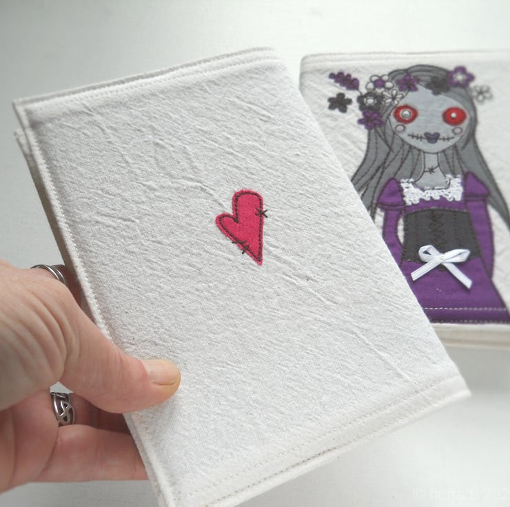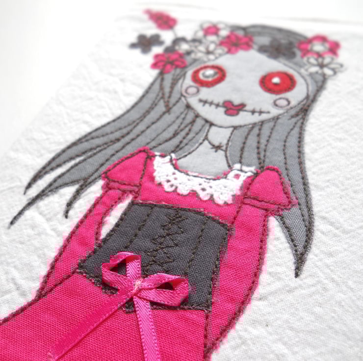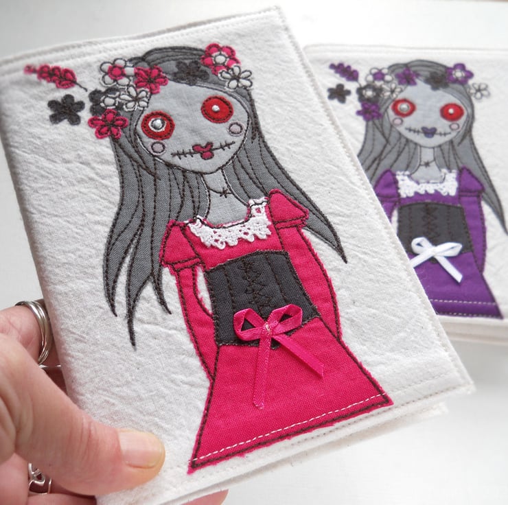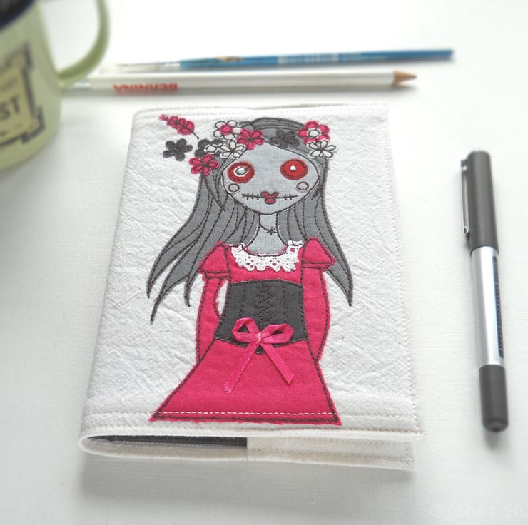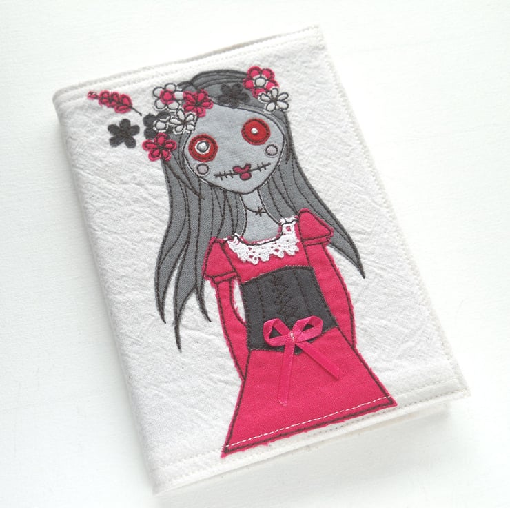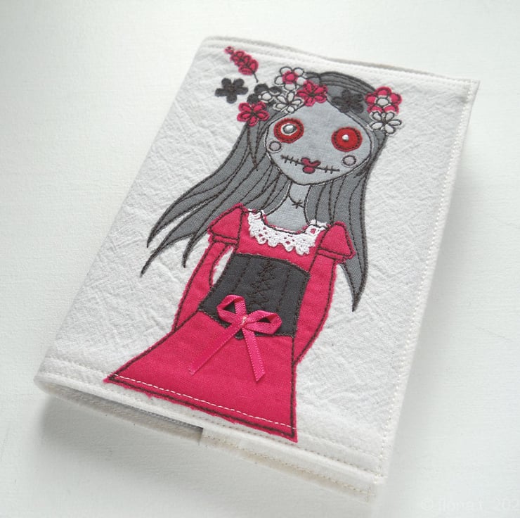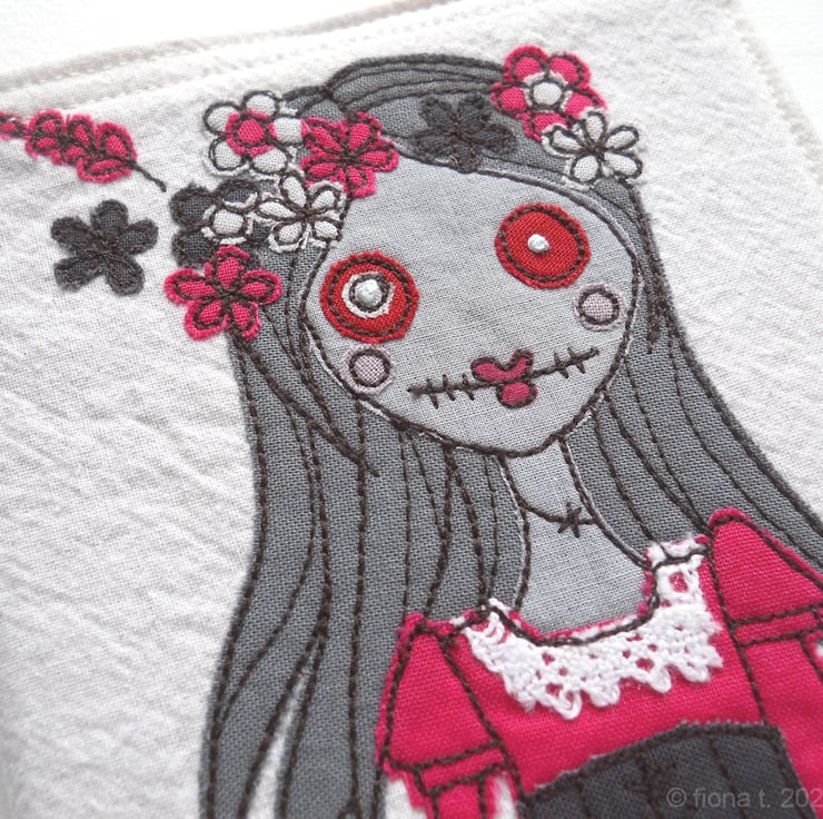 applique & freehand embroidered floral victorian zombie lady notebook cover with A6 sketchbook inside.