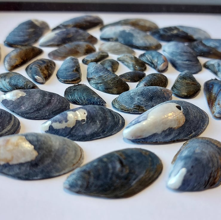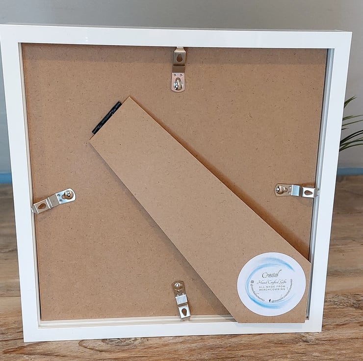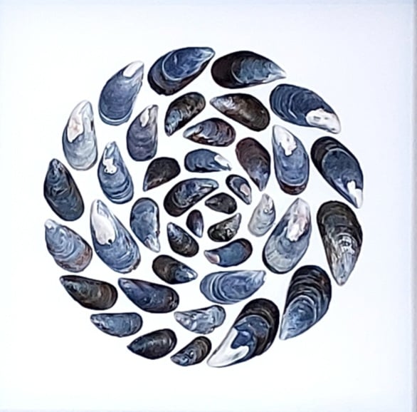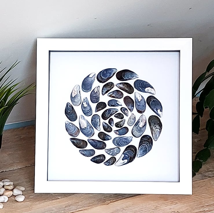 This 9x9in white frame, with black insert. Holds this lovely mussel shell art, which is in a circular pattern. I love working with mussel shells, as they are all unique.