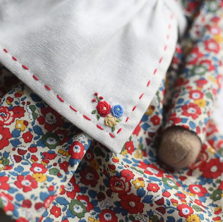 She is wearing a removeable dress made from beautiful Liberty of London fabric in Katie and Millie Red with a little Peter Pan collar.