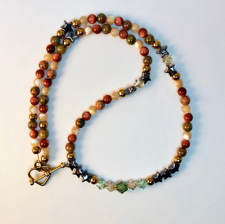 The body of the necklace is a mix of 4mm Unakite, Goldstone and Mother-of-Pearl beads and six more 6mm puffed Hematite stars, a further two Swarovski crystals, and a smattering of golden Hematite.