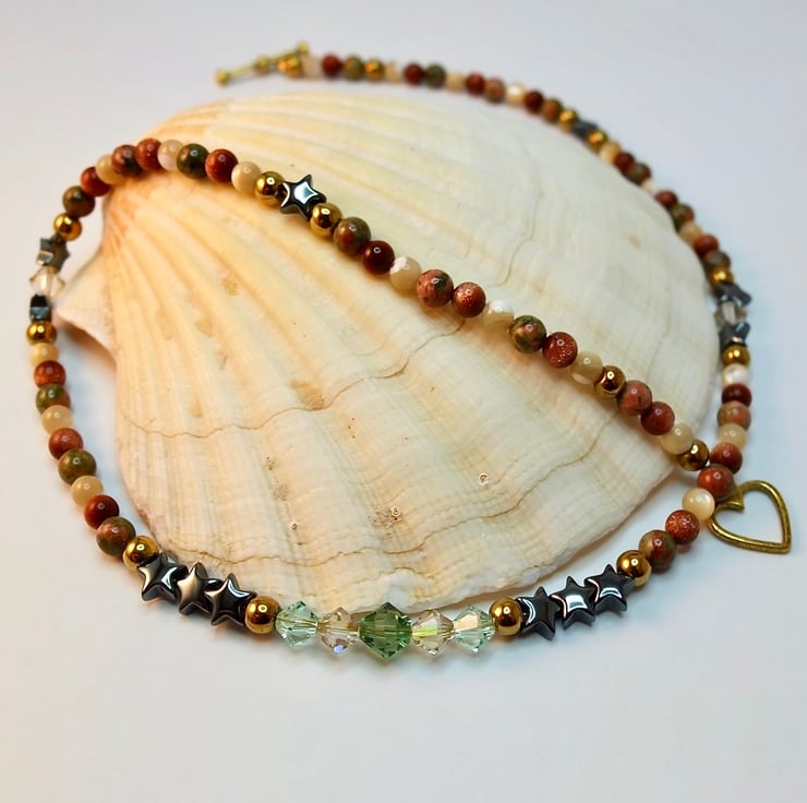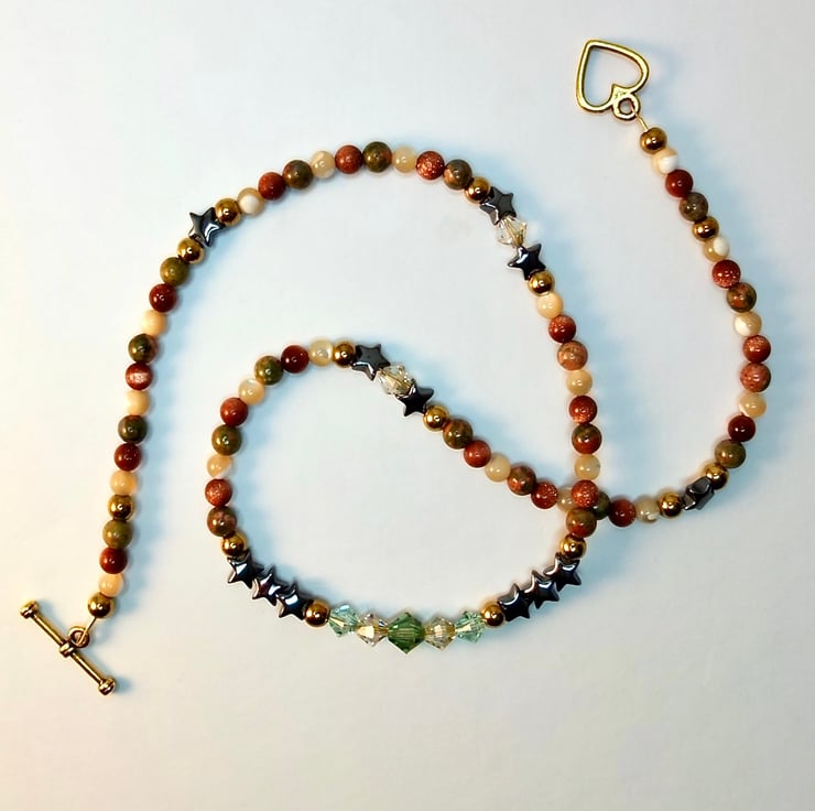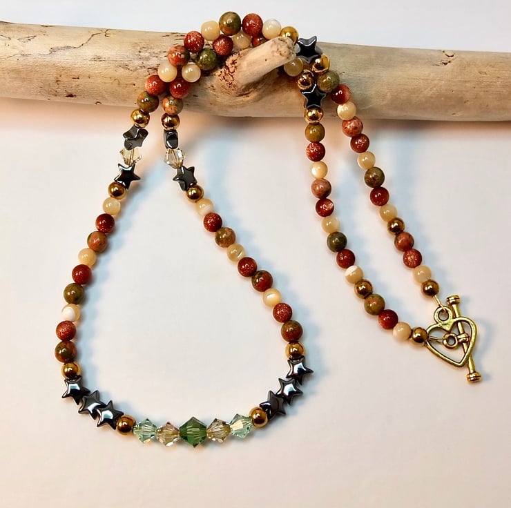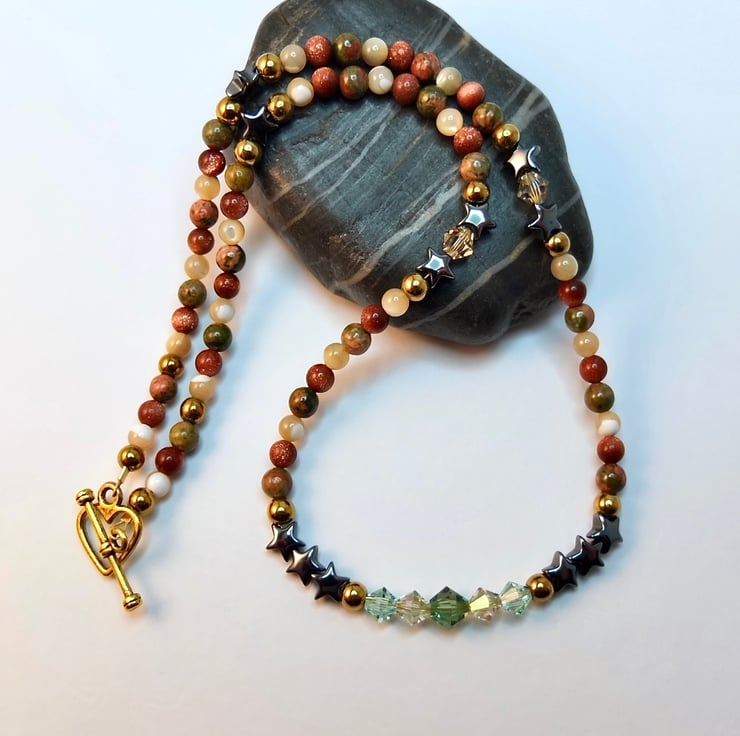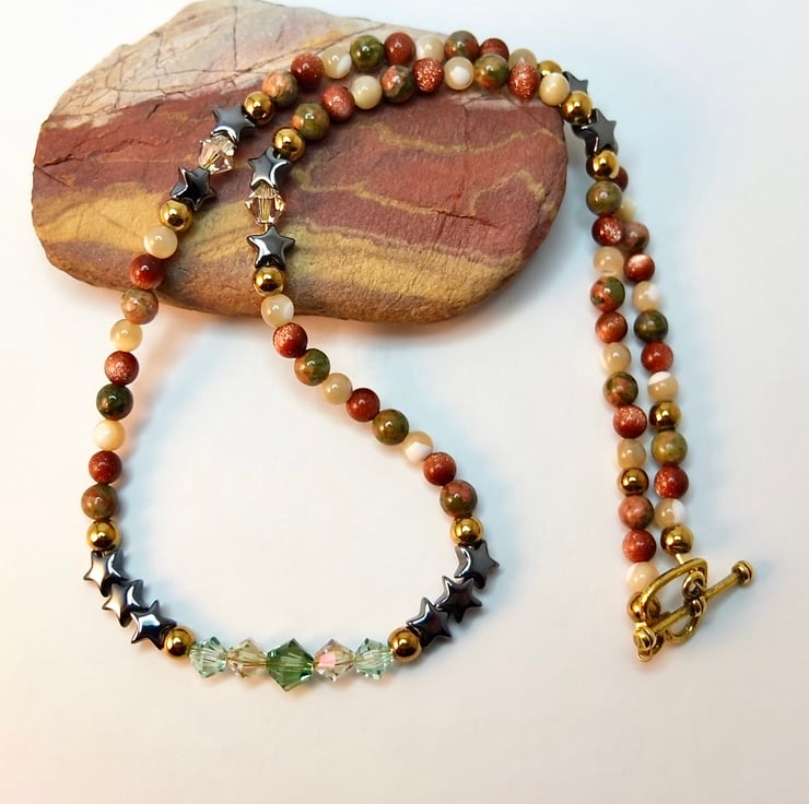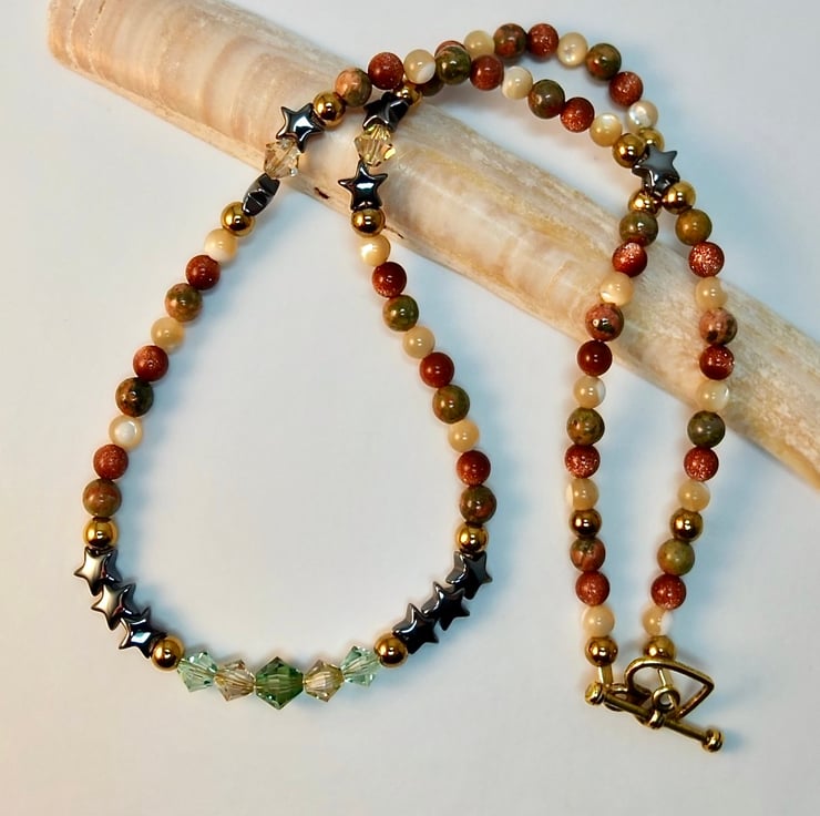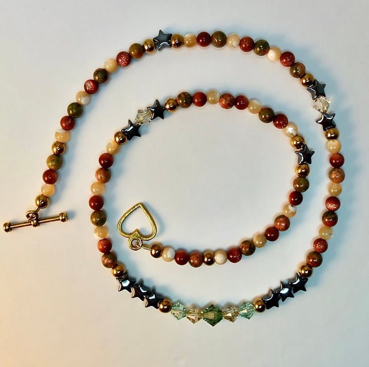 The body of the necklace is a mix of 4mm Unakite, Goldstone and Mother-of-Pearl beads and six more 6mm puffed Hematite stars, a further two Swarovski crystals, and a smattering of golden Hematite.