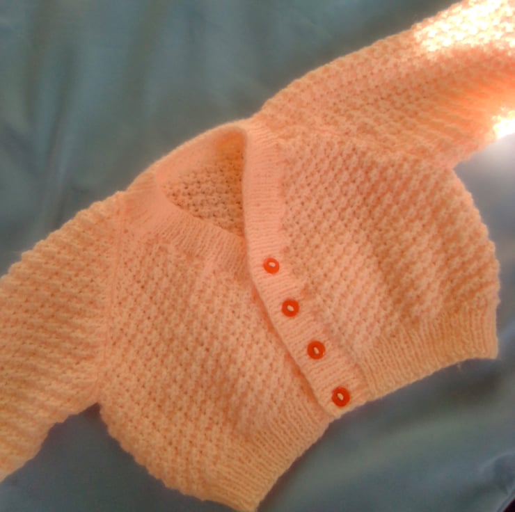 This cute 3 piece cardigan set for baby comprises a v-neck cardigan, a bonnet and a pair of booties. It would make an ideal gift for a baby for a baby shower, a Christening or as a coming home outfit.
