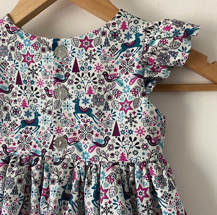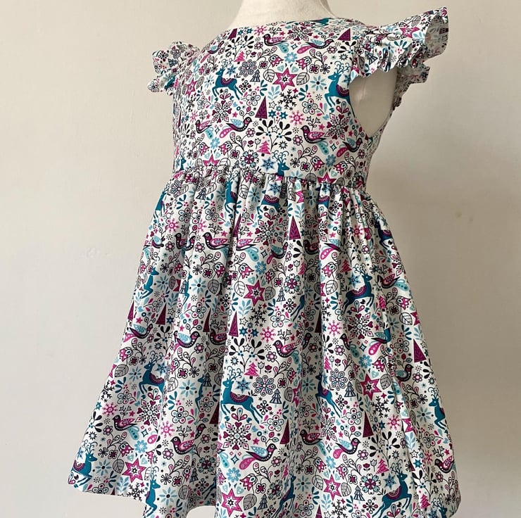 Toddlers flutter sleeve dress made from a beautiful Christmas Liberty print fabric.