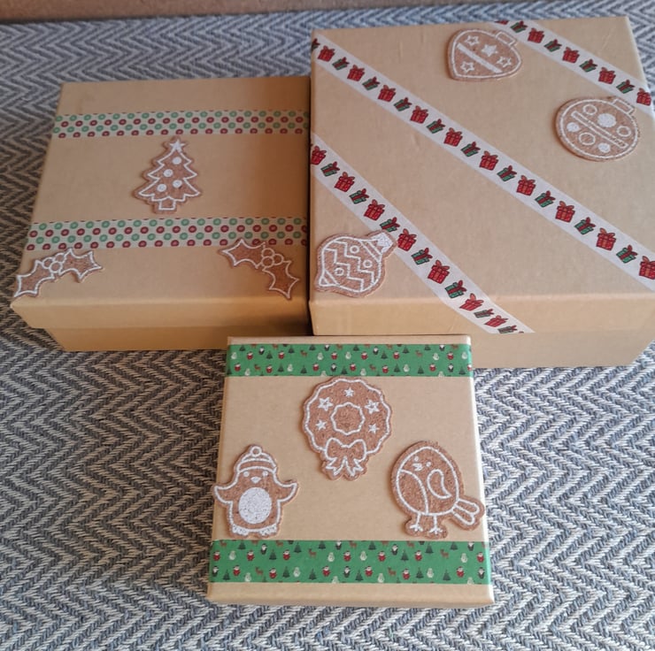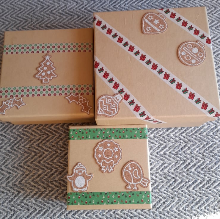 Sturdy set of 3 square decorated boxes. Perfect for that little bit of extra on your Christmas gifts.