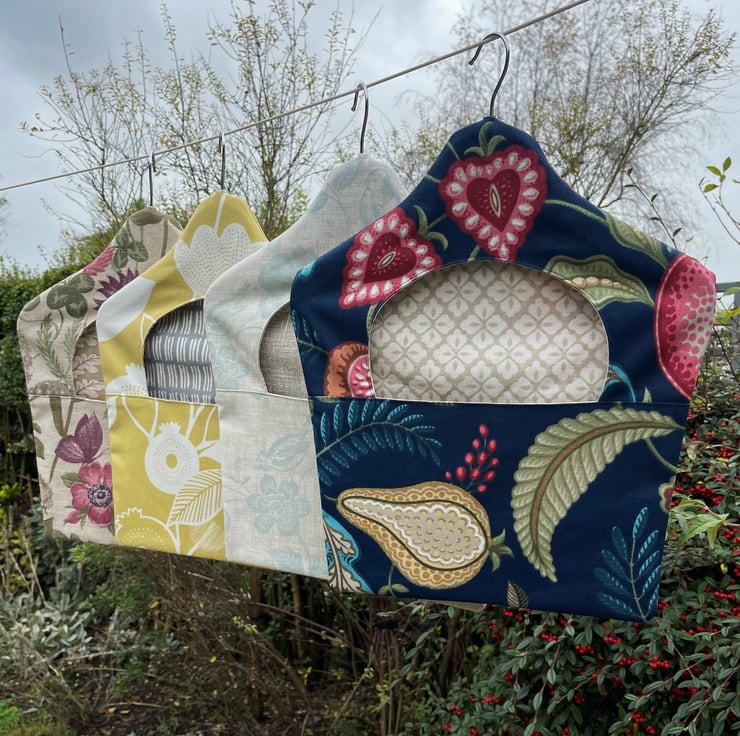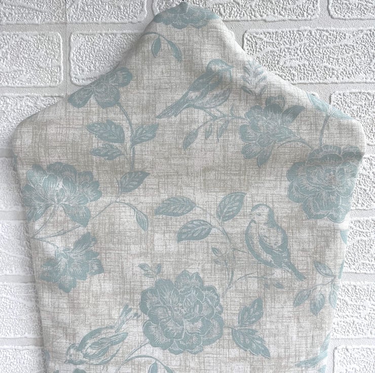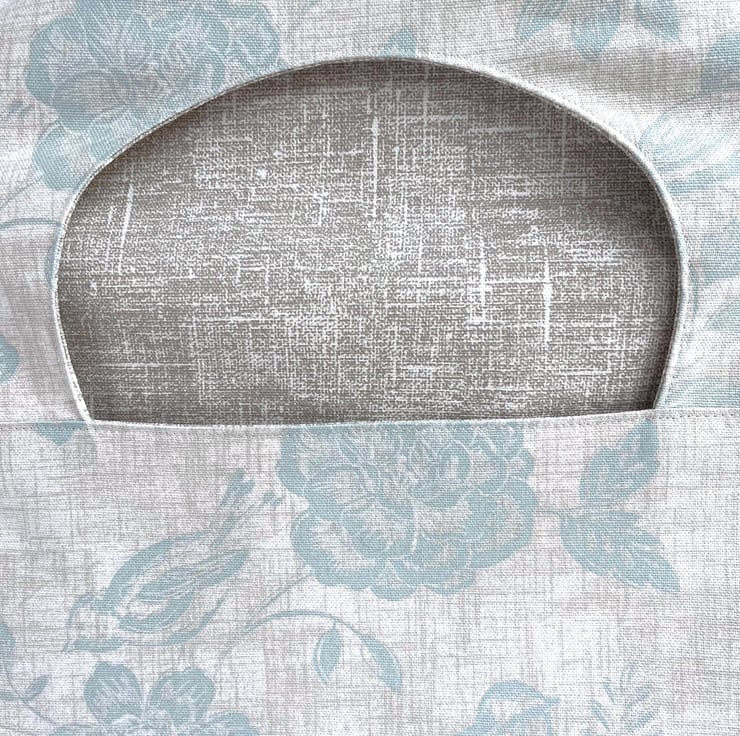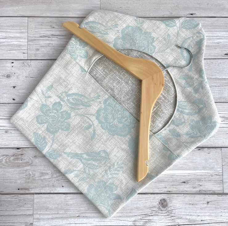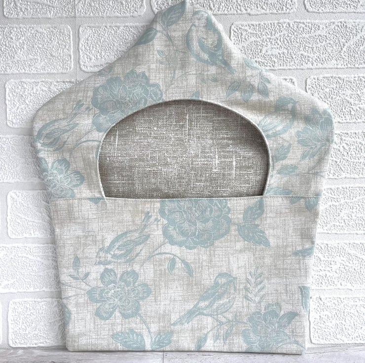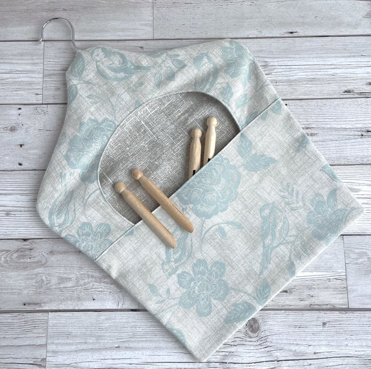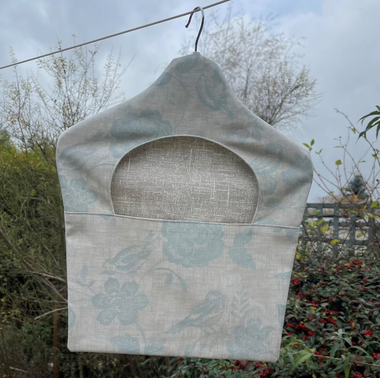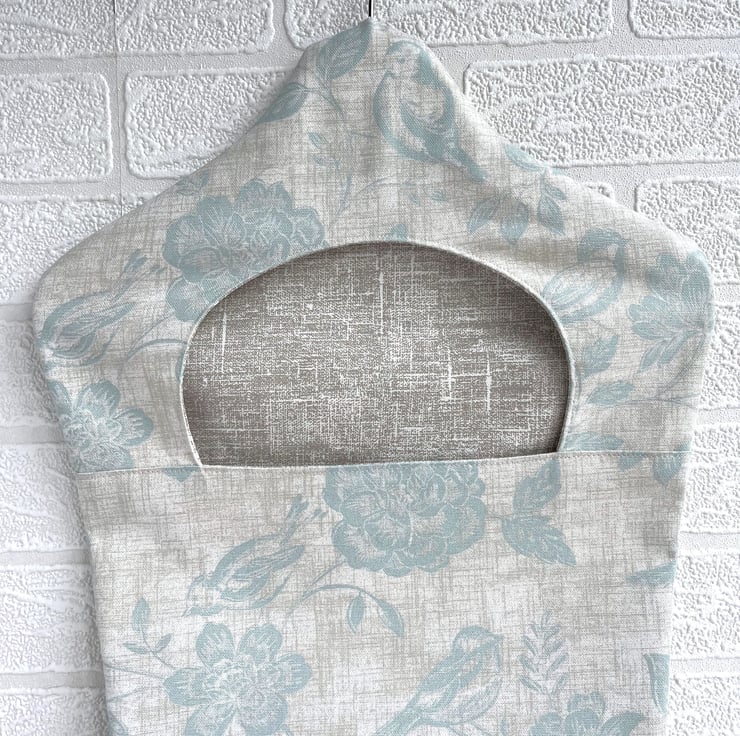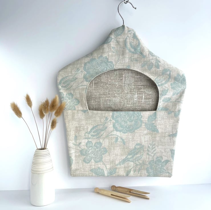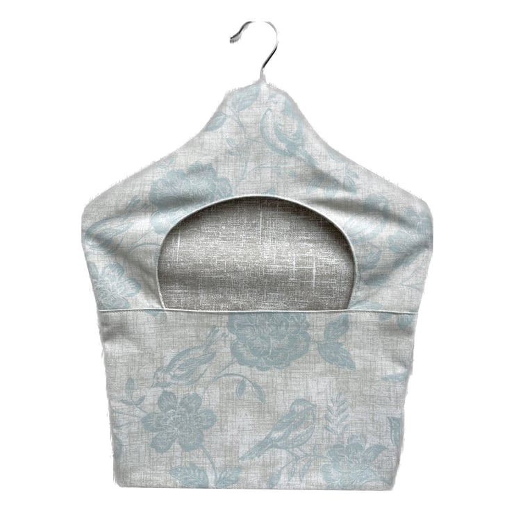 SALE. Peg bag with garden birds and flowers. This pretty peg bag is made from cream fabric with a delicate pastel print pattern featuring garden birds and flowers. The background colour is cream, with subtle beige flecks running vertically and horizontally. The pattern is depicted in a beautiful pastel duck-egg blue, and features small garden birds amongst leafy stems and large flowers. The bag is lined with beige fabric with a subtle print pattern of white flecks running vertically and horizontally. The large opening reveals the inner fabric, which co-ordinates beautifully with the outer fabric. It also allows easy retrieval of the pegs from inside. There are no raw seams, so the bag could be reversed if desired. The hanger is a good quality wooden hanger, and can be removed from the bag.