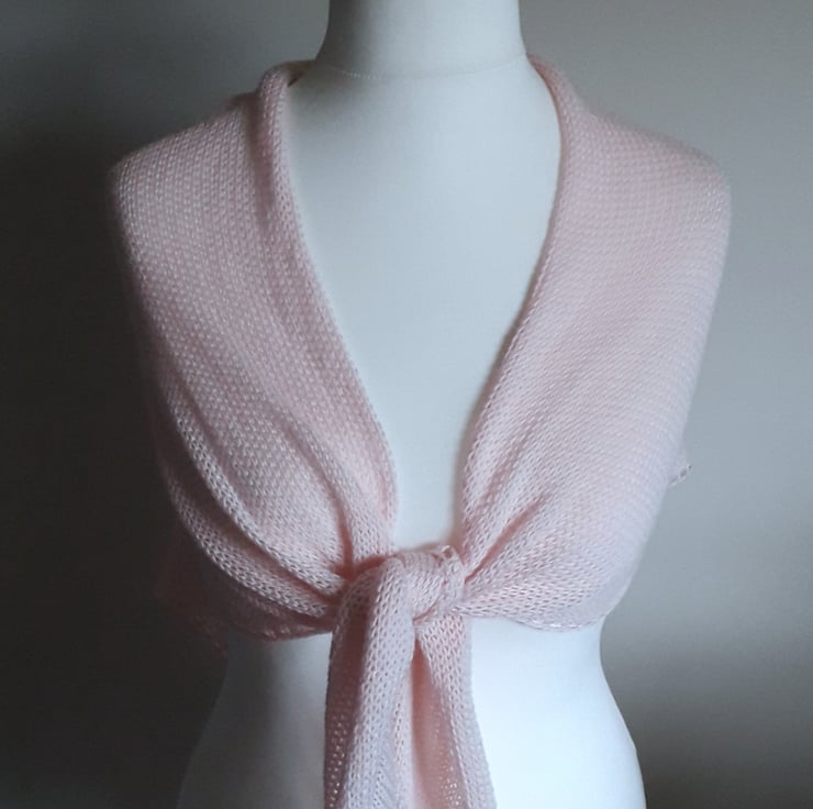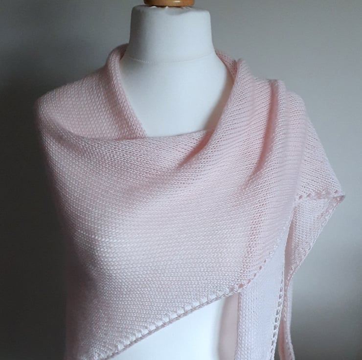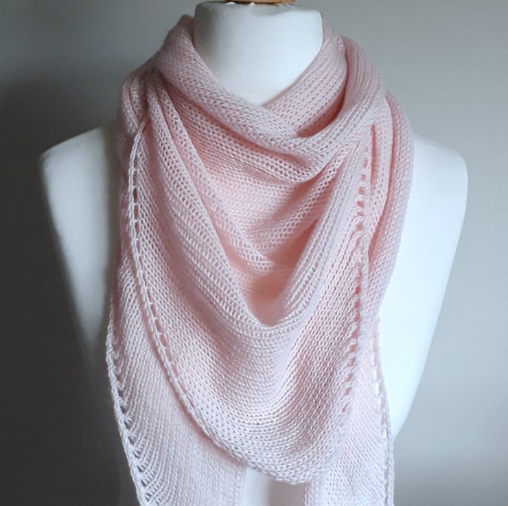This triangular shawl is beautifully soft and light, but also very warm and cosy. It has been lovingly knitted on a hand operated knitting machine using beautifully soft merino wool and features eyelets along two sides for a decorative finish.