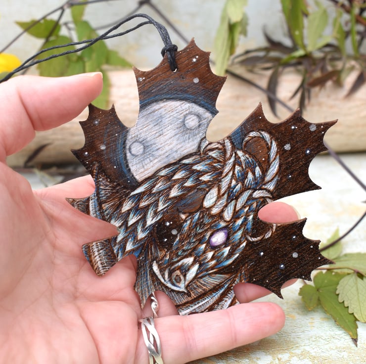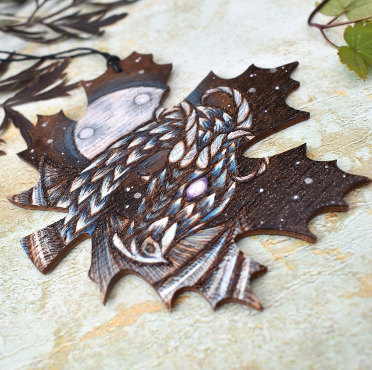 A lightweight maple leaf shape, with a majestic dragon design, burned into the wood using pyrography and coloured with art pencil, a truly unique original art piece.