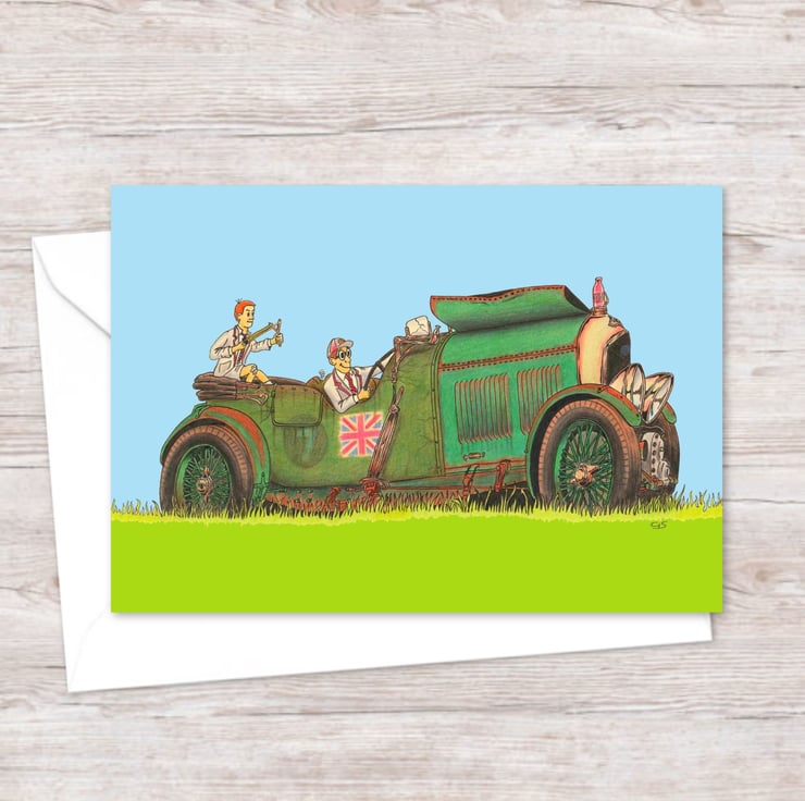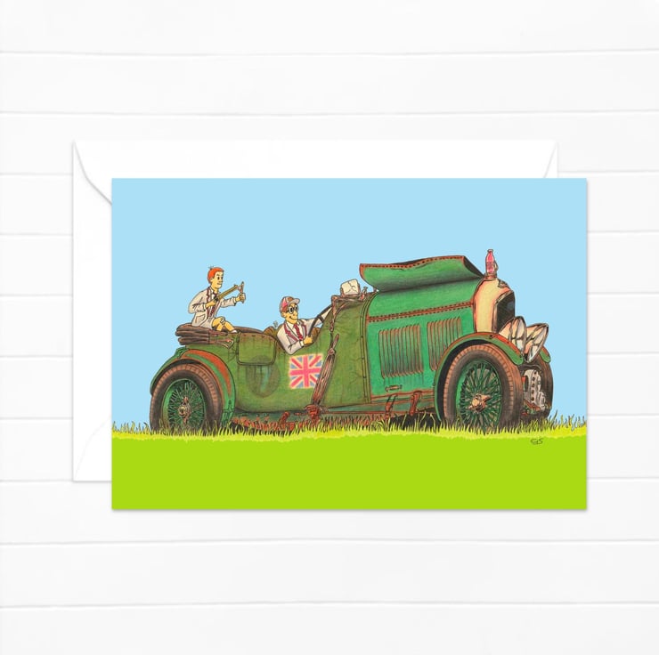 Original art greeting card featuring a hand-drawn pencil illustration of a couple of schoolboys making the most of an abandoned car. Artwork with a nostalgic feel.