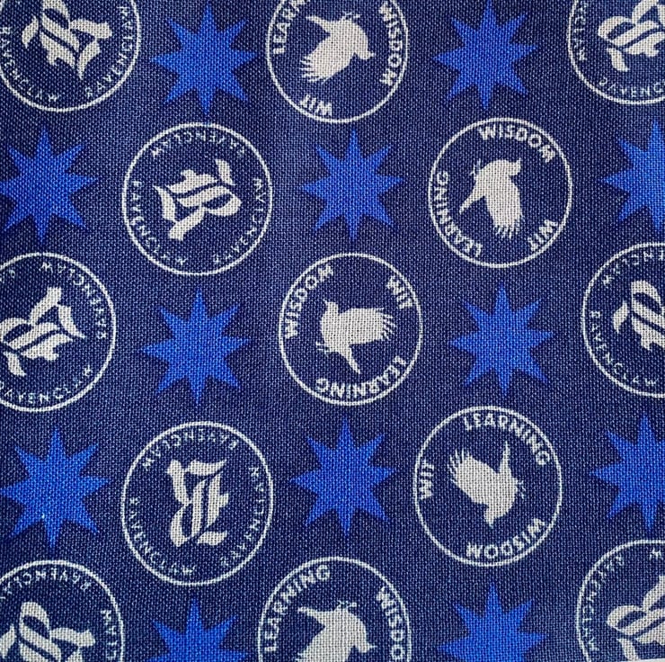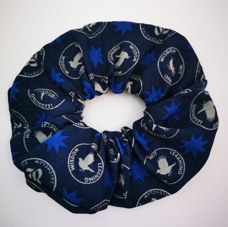 Harry Potter classic. Are you a Ravenclaw? This is a soft cotton scrunchie in almost navy blue with brighter blue stars and the house motto in circles across the length of the fabric.