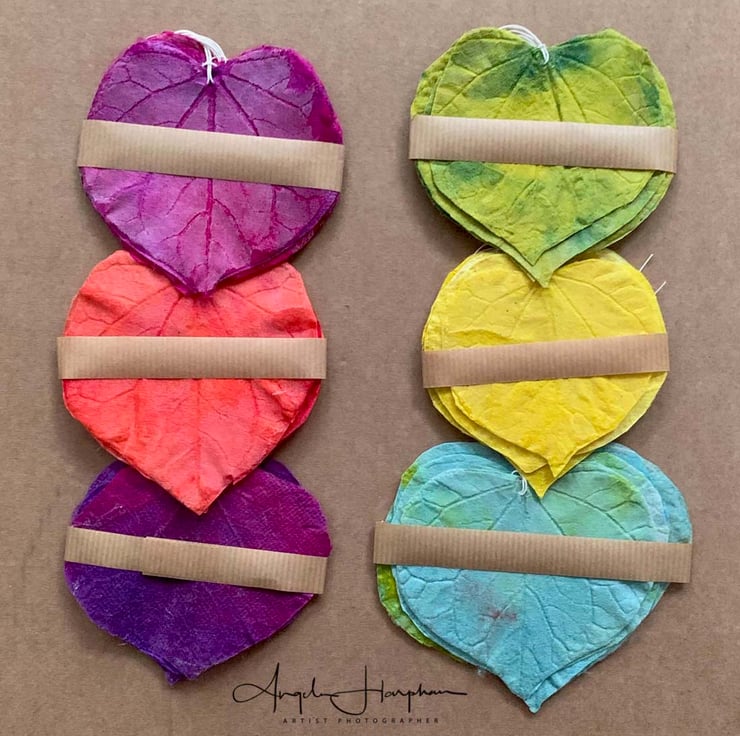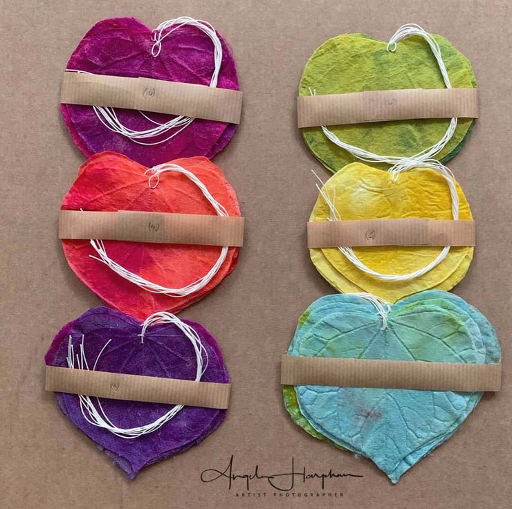 Silk fibre tags. Four delicate heart shaped leaf silk fibre tags that could also be used as decorative hangings. You are buying one pack of four single leaves of the colour green. They are threaded with bookbinding twine, and can be written on with a gel pen. The silk fibre is made from a waste product of the silk industry. Gift for a loved one any time.