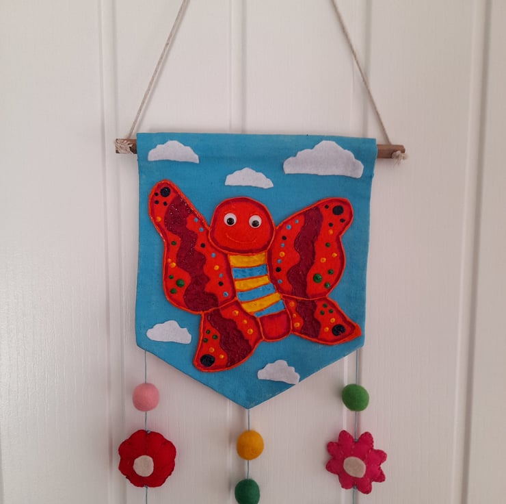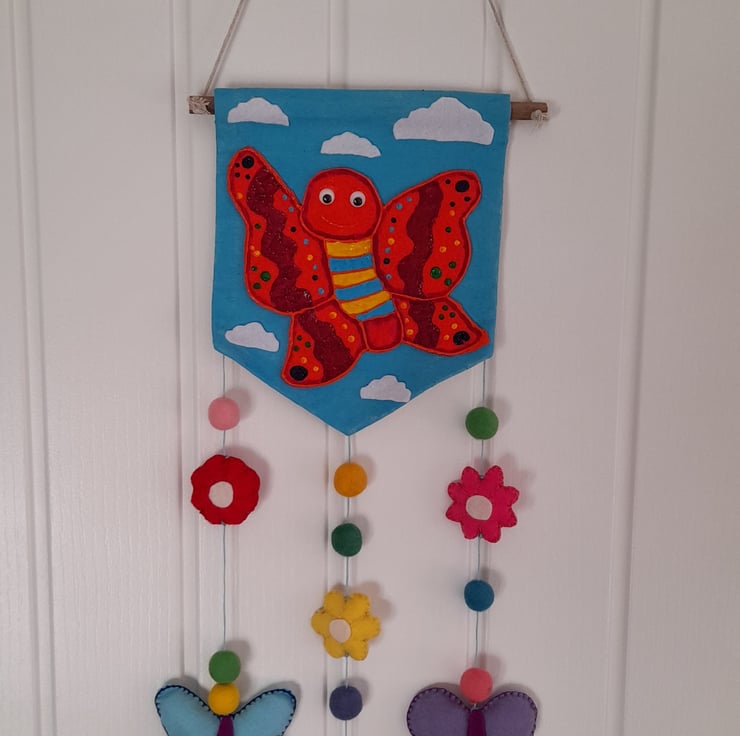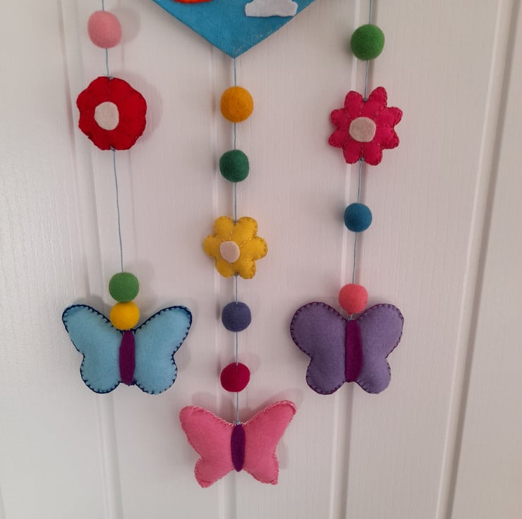 Hanging down are 3 strands of cotton with felt pom poms and 3D stuffed felt butterflys and flowers.