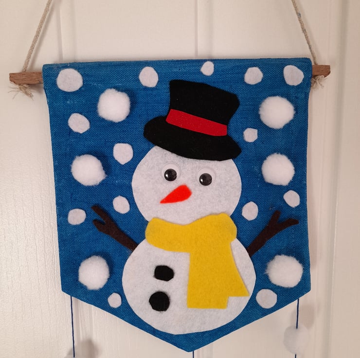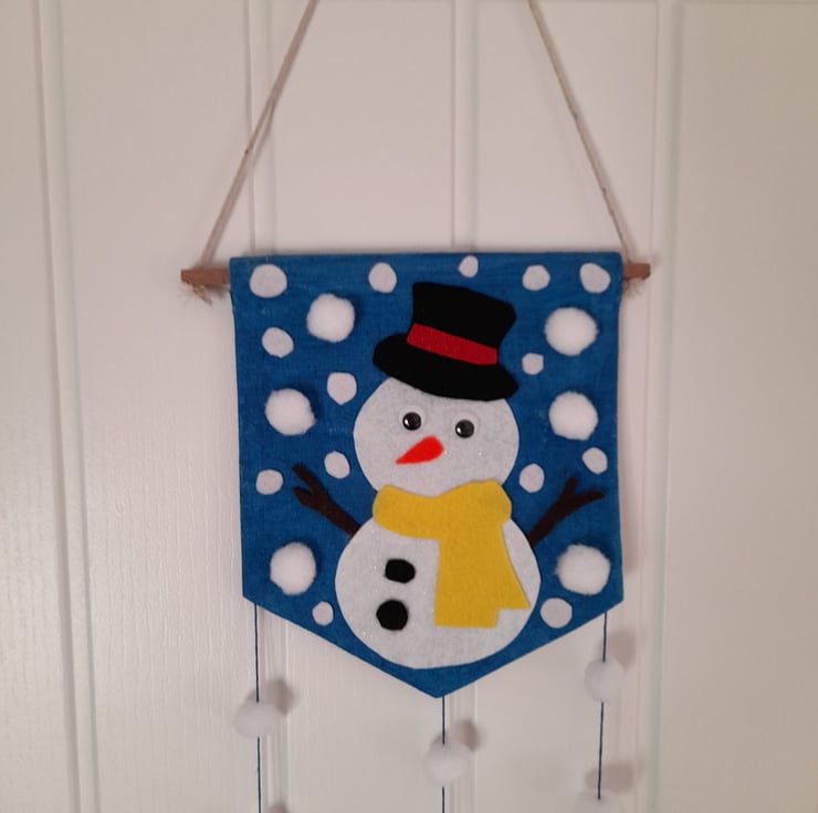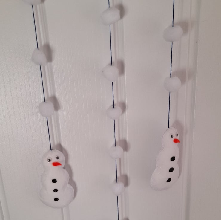 Hanging down are 3 strands of cotton with felt pom poms and 3D stuffed felt snowmen.