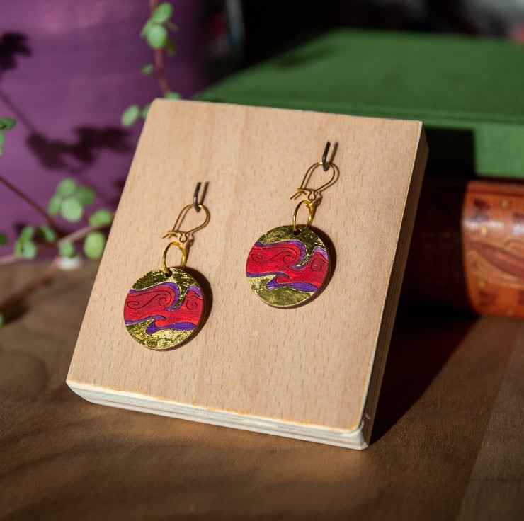 A bold swirl of red, gold, and purple brings cosmic vibes to these dreamy planet-inspired earrings. Hand-painted and finished with gold foil, they’re lightweight, vibrant, and totally out of this world.