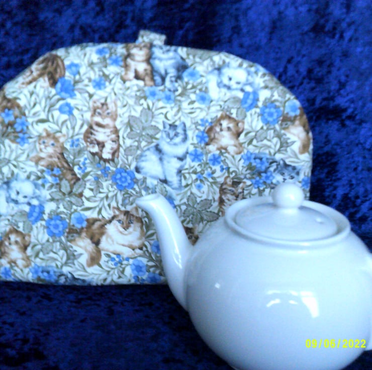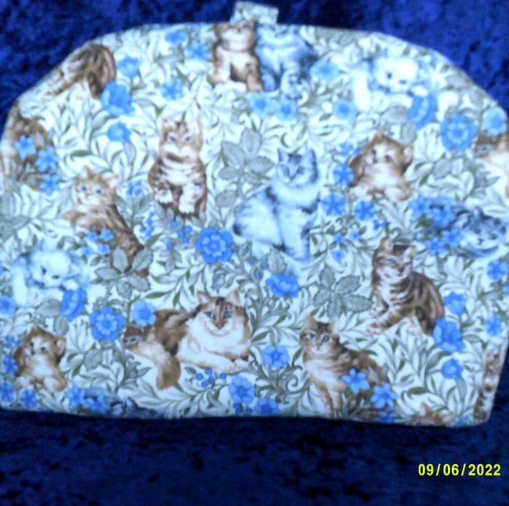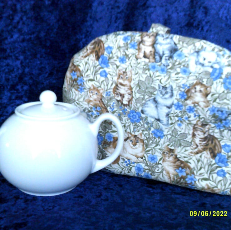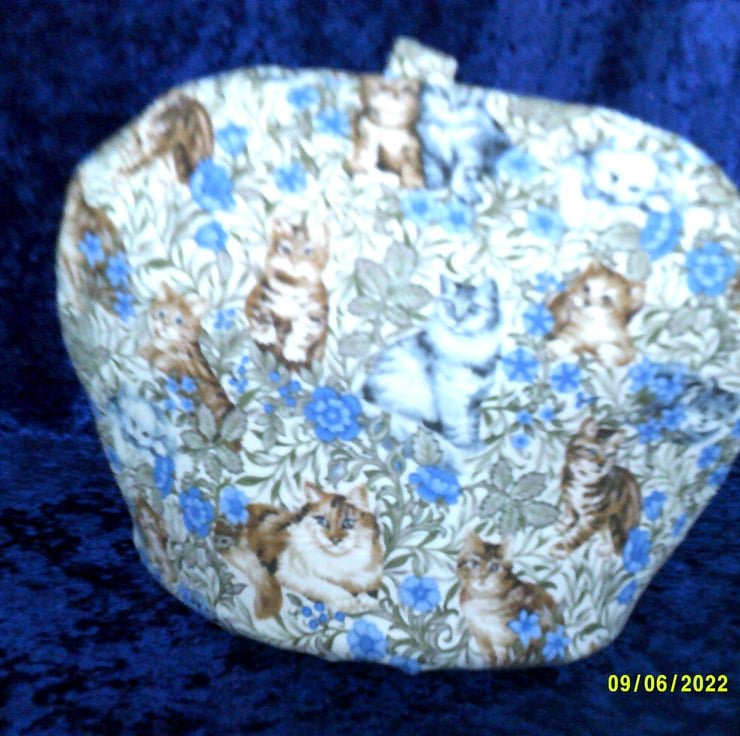 The design of the fabric used for this tea cosy is of Cats with blue flowers on a grey background.