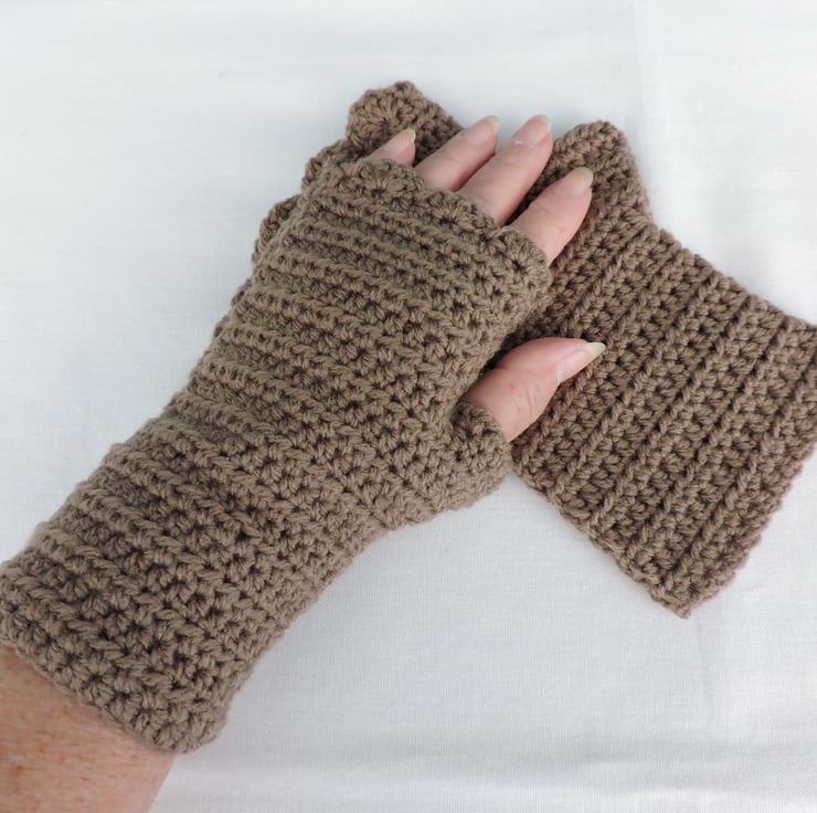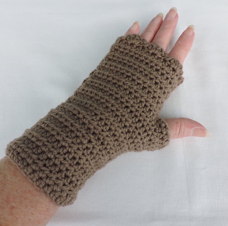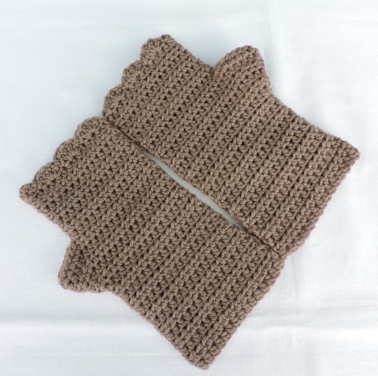 Seconds Sunday end of line clearance These adults fingerless mitts have been crocheted using a double knit 100% acrylic yarn. A classic fawn colour. These mitts have a plain body with a wavy edge top. A cosy winter warmer which is ideal for dog walkers and those who need to have their fingers free.