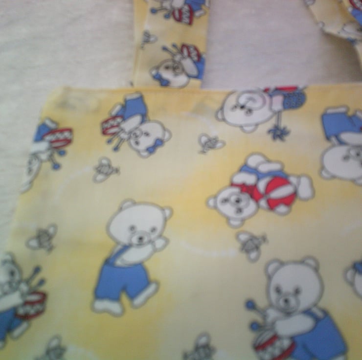 This Childs Handbag Fabric bag is made using a 100% Cotton Fabric featuring teddy bears playing on a lemon background.